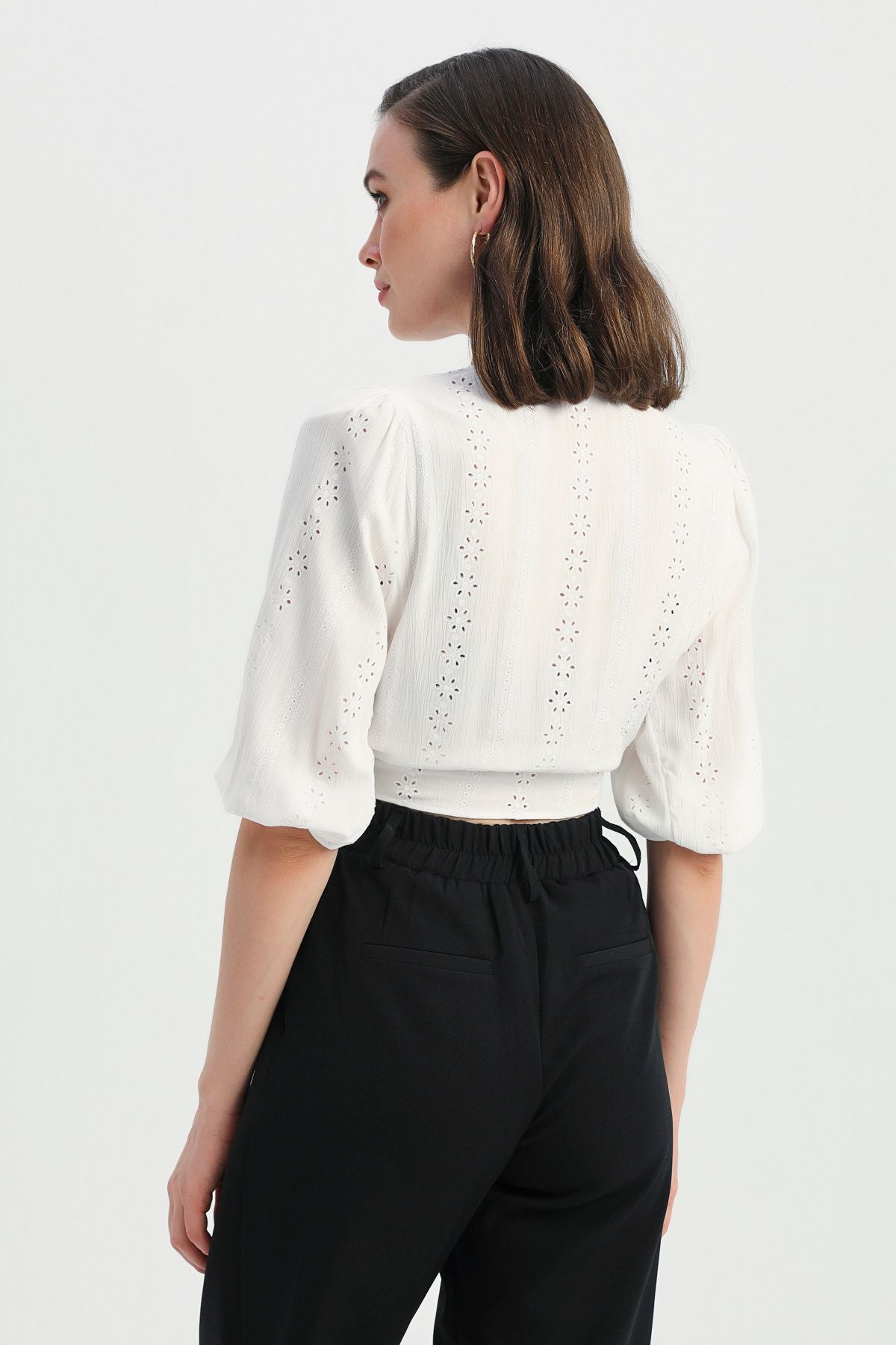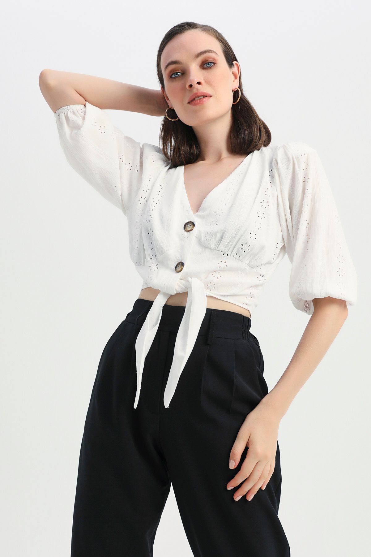 Vatkalı Önü Düğmeli V Yaka Bluz Ekru