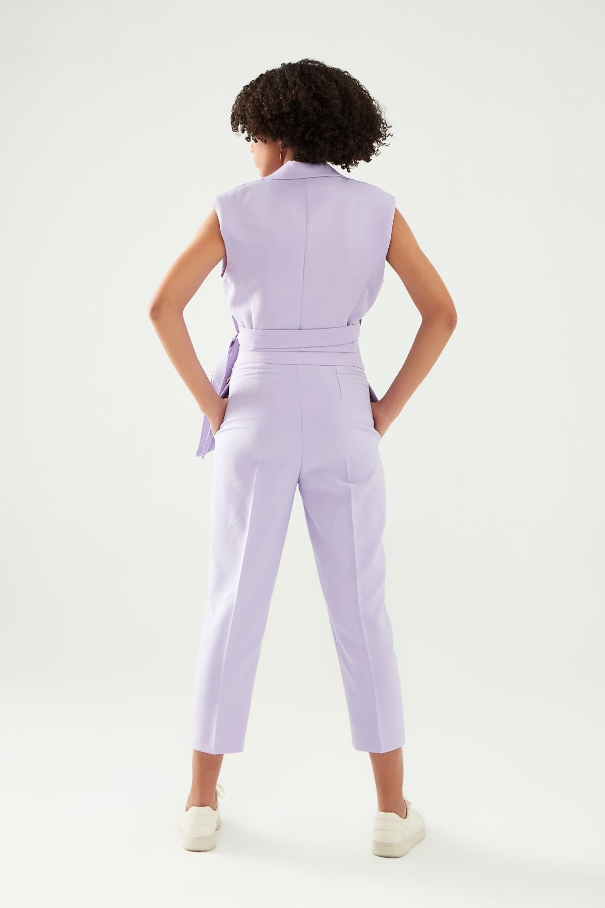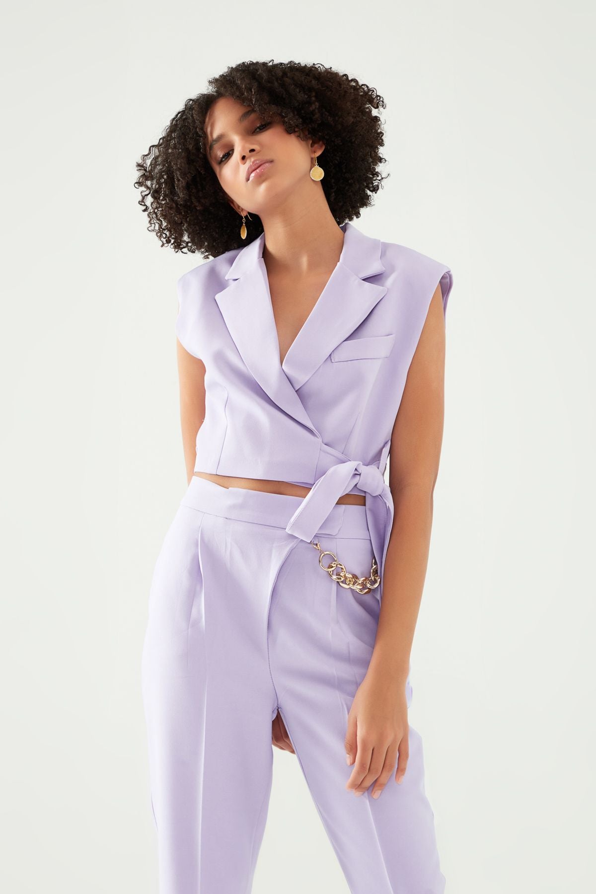 Kruvaze kesimli crop yelek, hafif düşük omuzludur. Kemer detaylıdır. Astarlıdır.