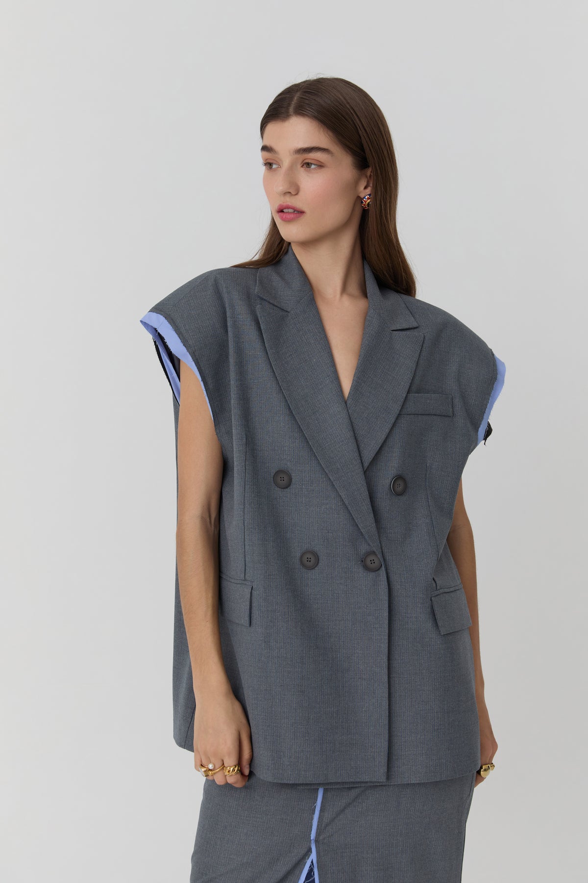 Sırt dekolteli, kruvaze yaka, ince çizgili, renkli garni detay kolsuz, çift cep kapaklı, düğmeli, yelek ceket.