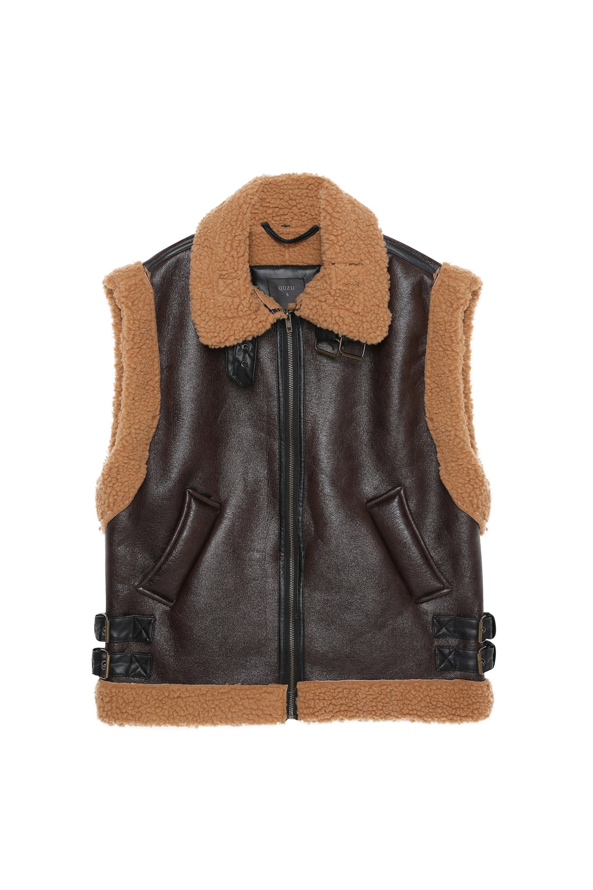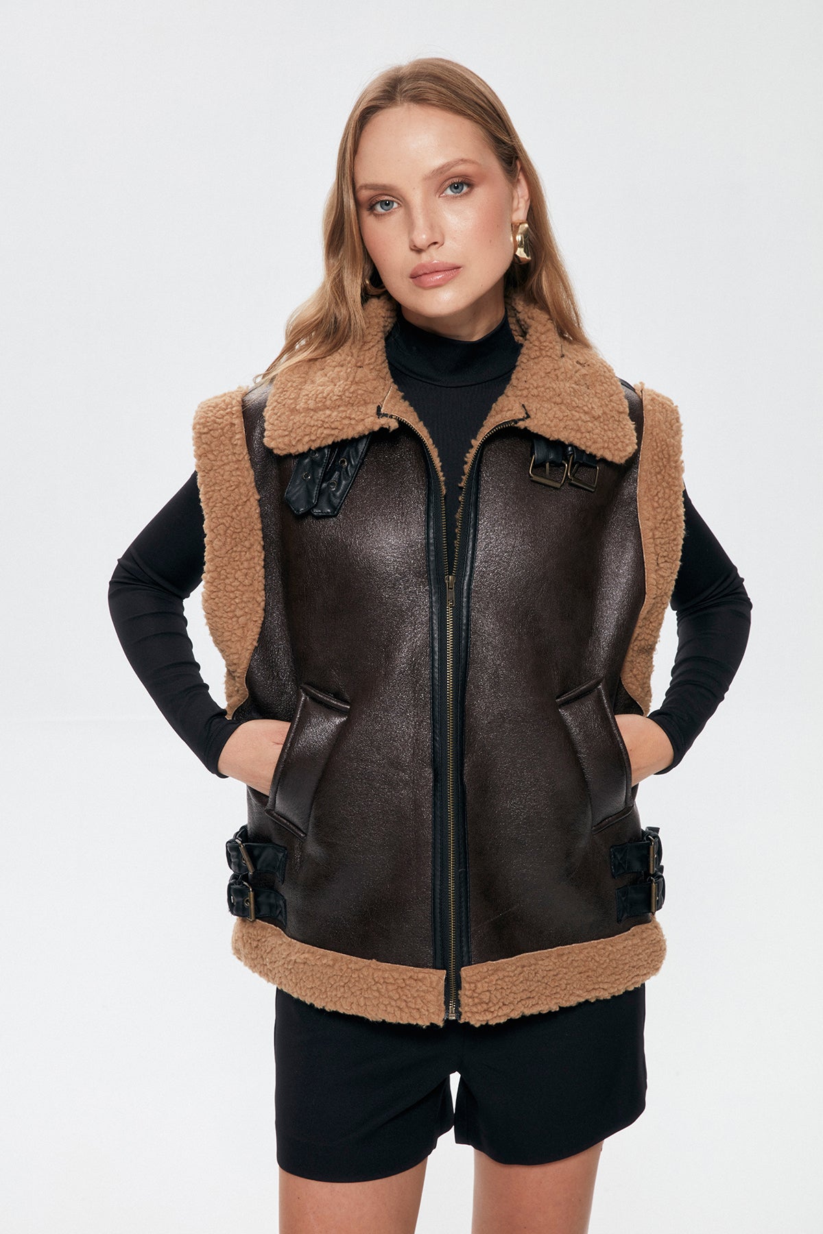 İçİ kontrast sunİ yünlü, sunİ süet kolsuz yelek,ayarlanabİlen bantlı katlı yaka.