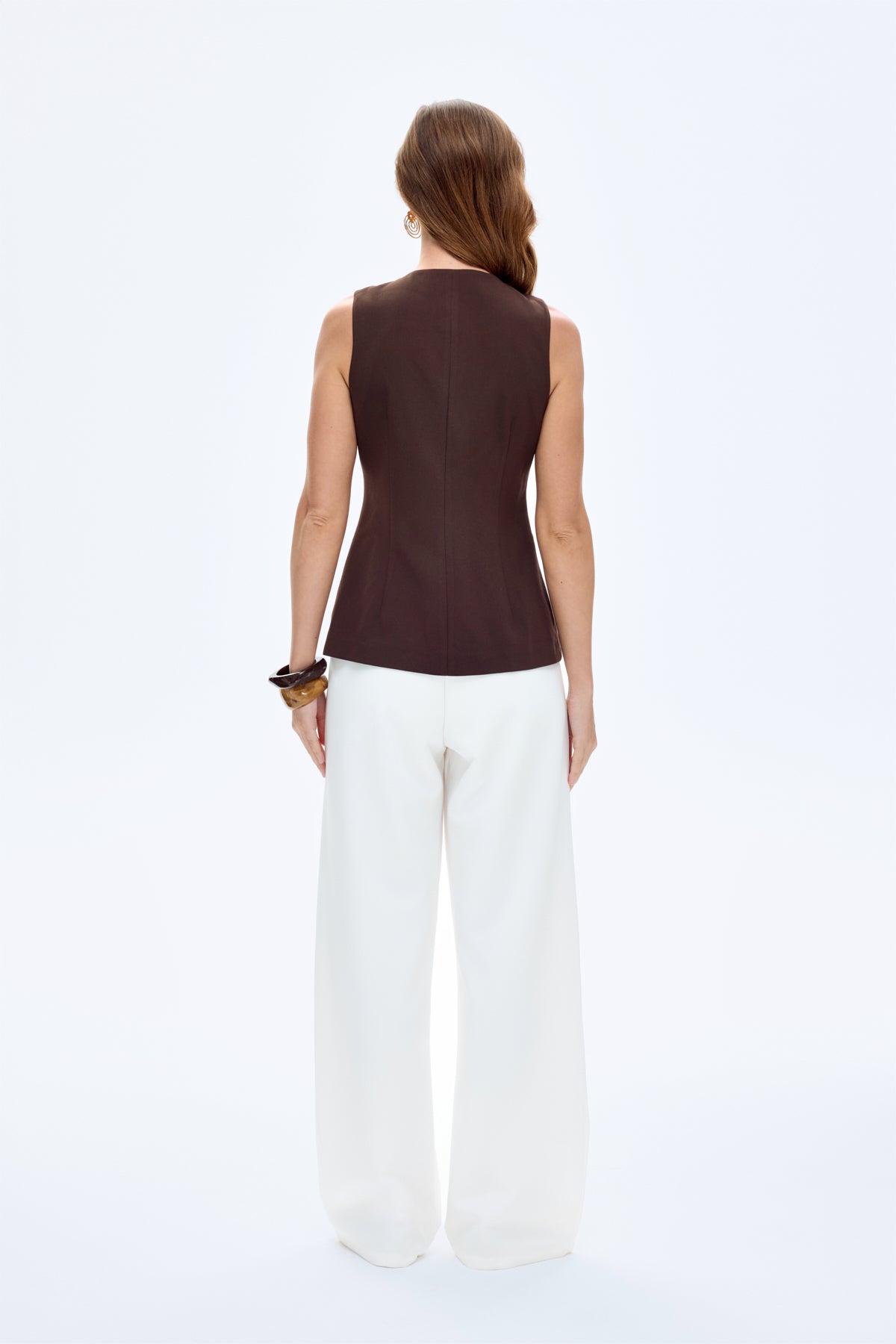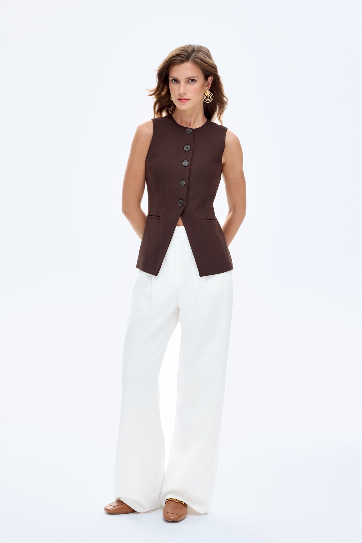 Ön Yırtmaç Detaylı Yuvarlak Yaka Düğmeli Yelek Ceket Kahverengi