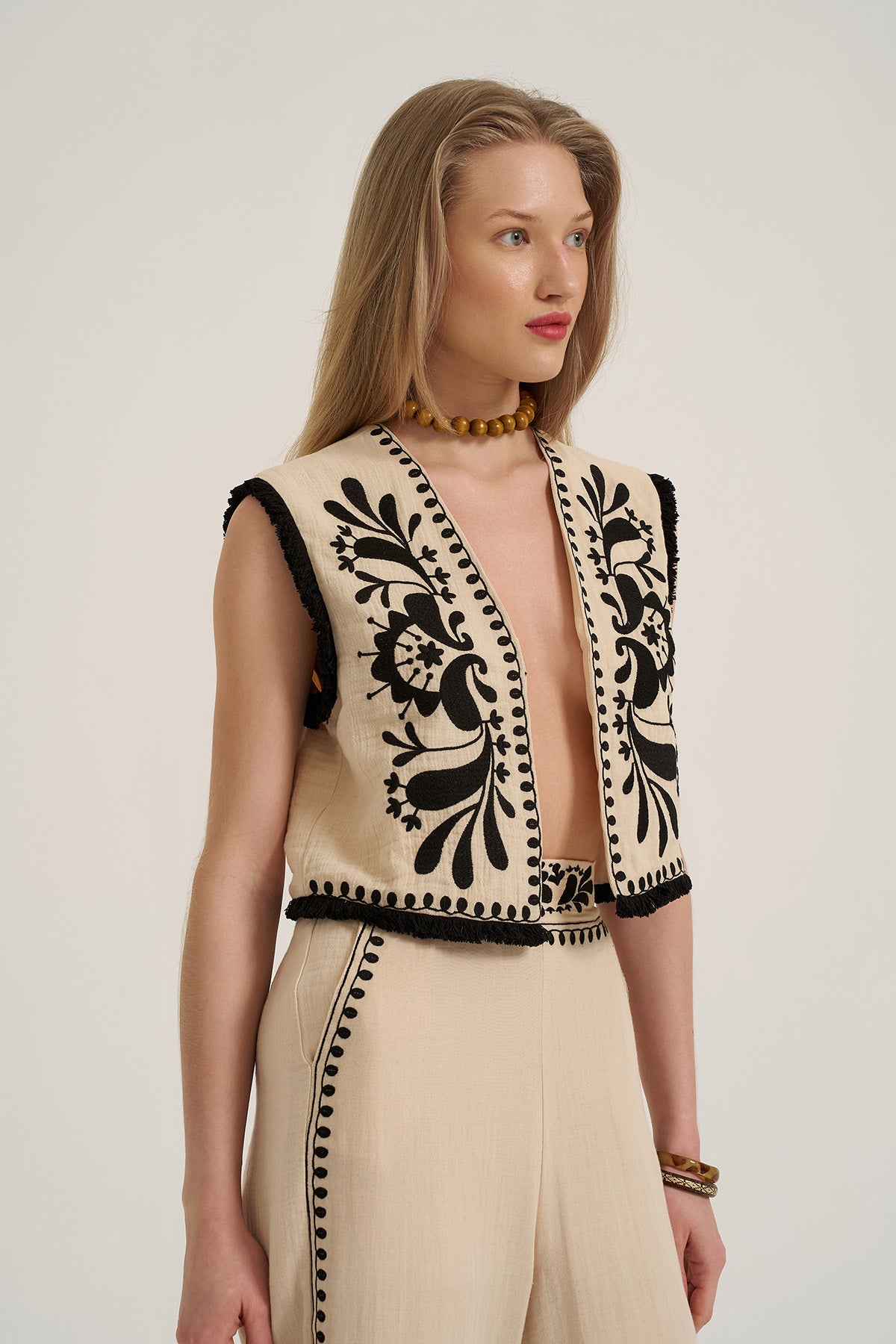 Püskül detaylı, nakışlı, pamuklu yelek.