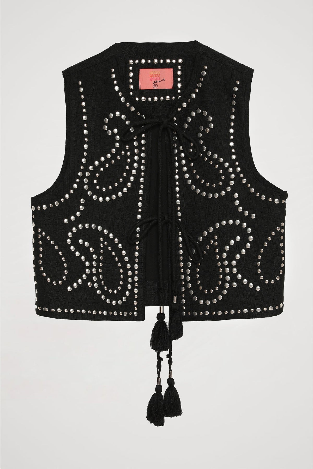 Metalik zımba detaylarıyla süslenmiş, püsküllü bağcık tasarımlı, içi astarlı, şık ve modern kısa yelek.