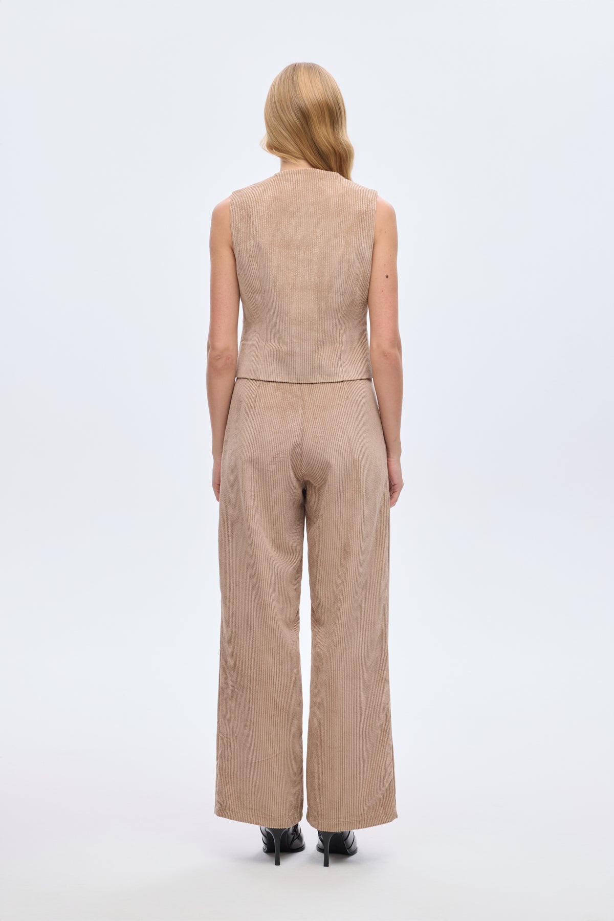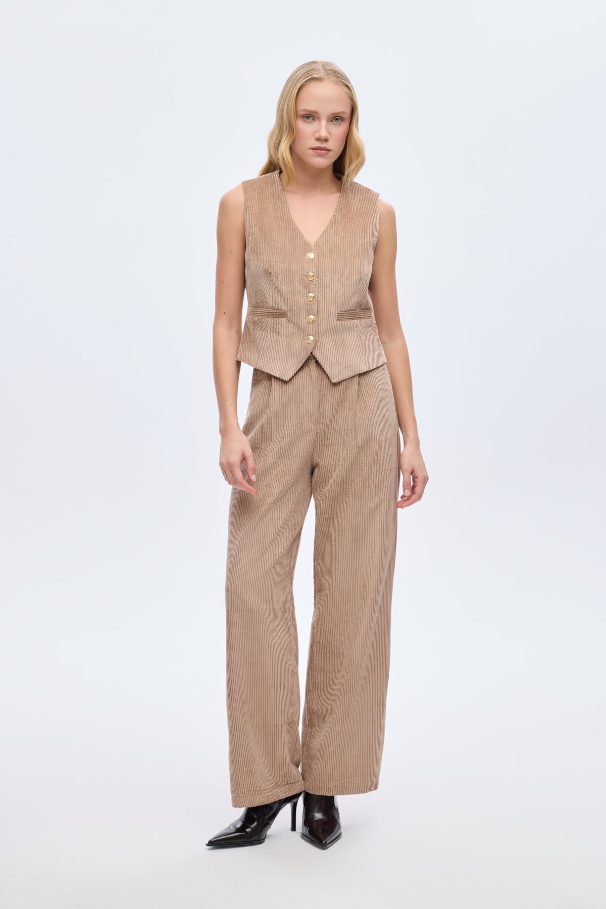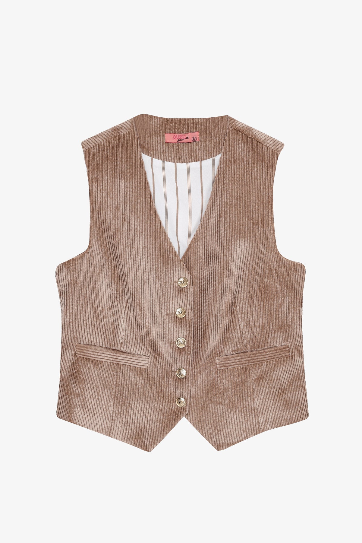 İçi çizgili astarlı, v yaka, kadife dokulu, önü gold düğme kapamalı, gizli cepli, vücuda oturan kalıpta, kısa yelek.