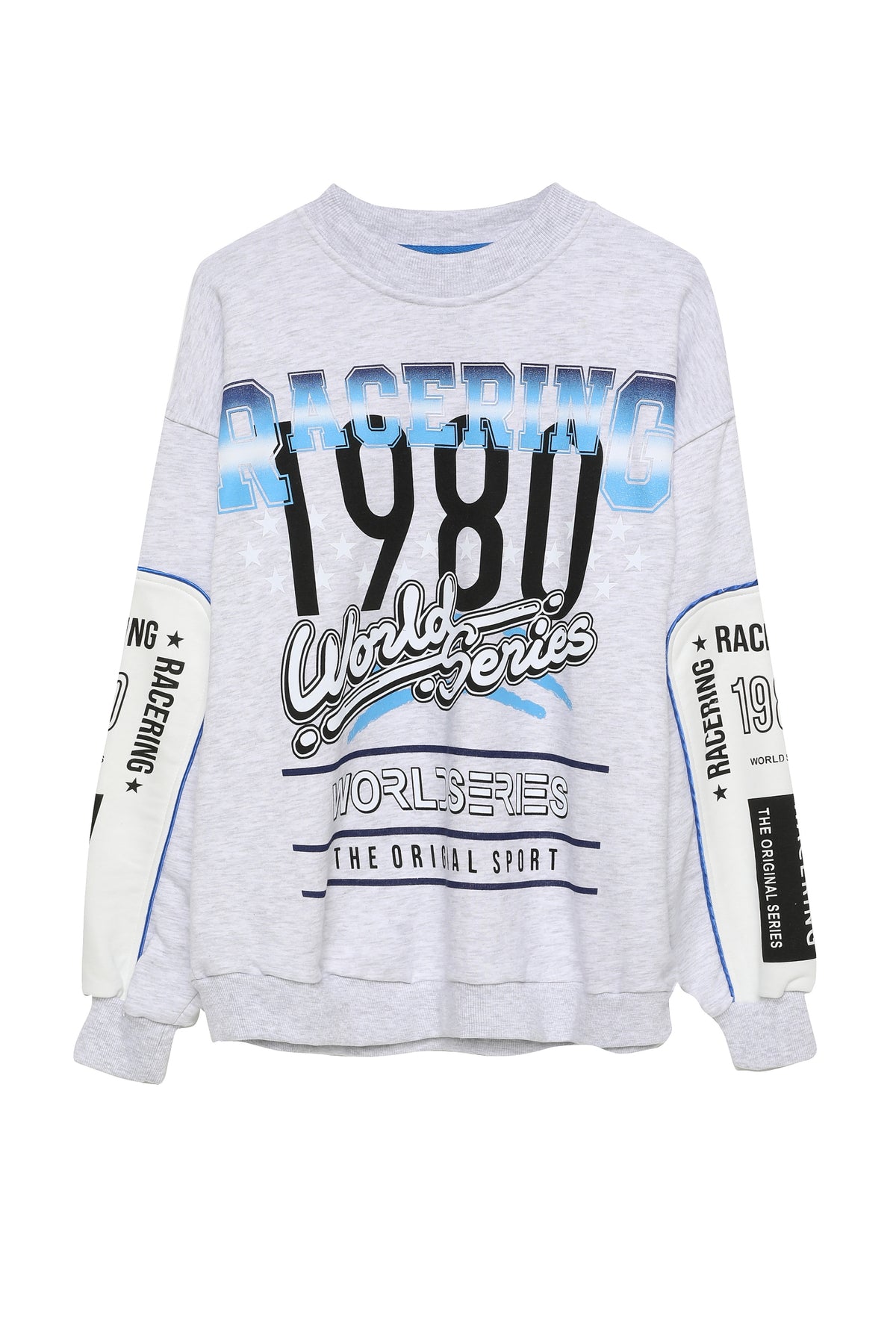 Oversized sweatshirt with a round neckline, printed on the front and sleeves, long sleeves and cotton content.