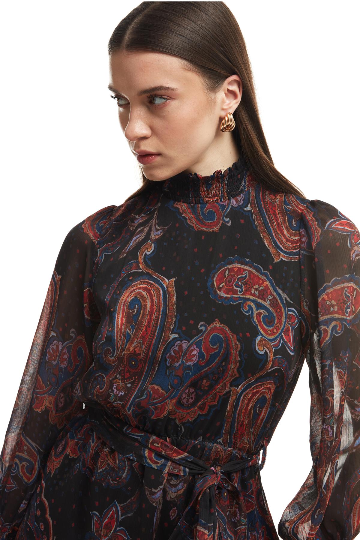 Mini chiffon dress with ruffle detail on sleeves and neckline, long sleeves, lining, concealed zip fastening on the back, elasticated waist, tie belt.