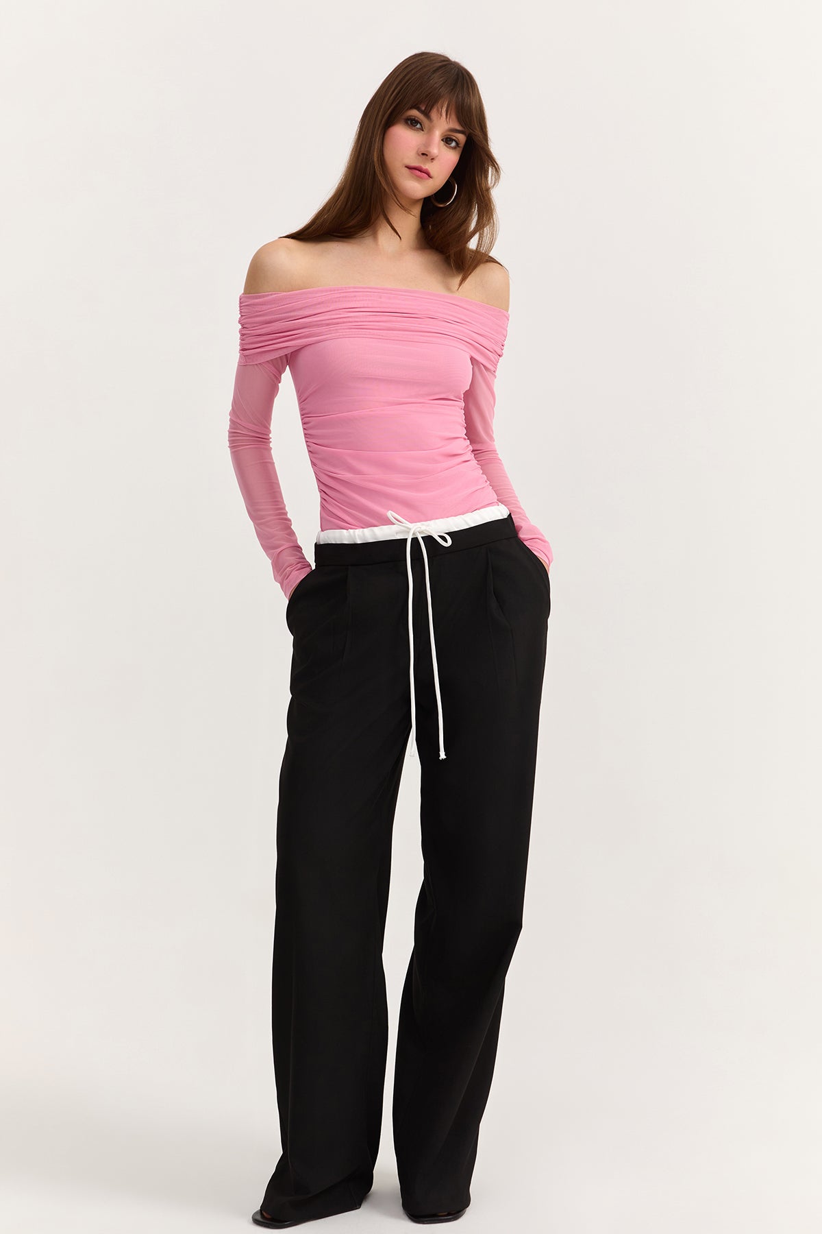 Boxer bel detaylı, İp bağlamalı, düz paça pantolon.