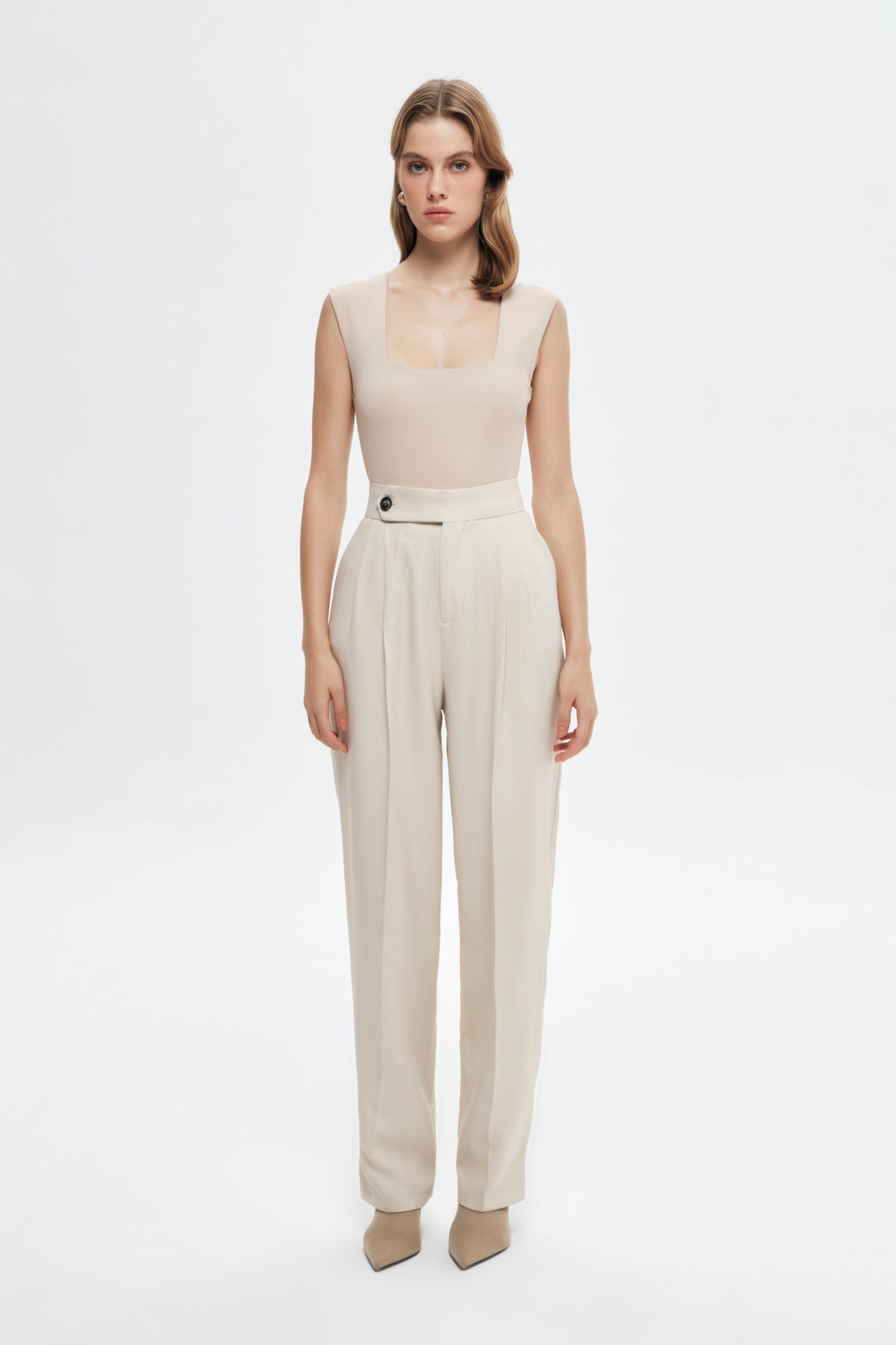 High waist, single button detail at the waist, zip fastening, loose fit, pleated trousers.