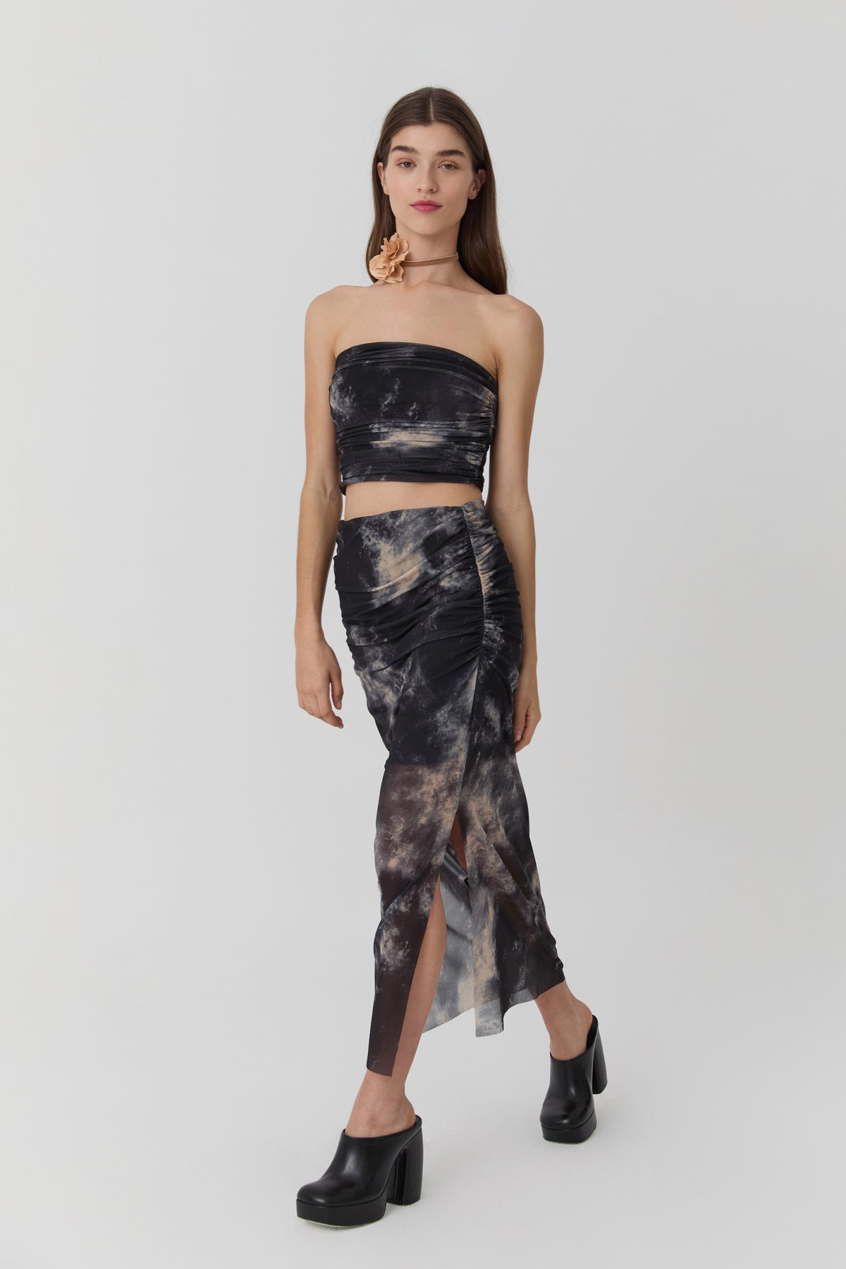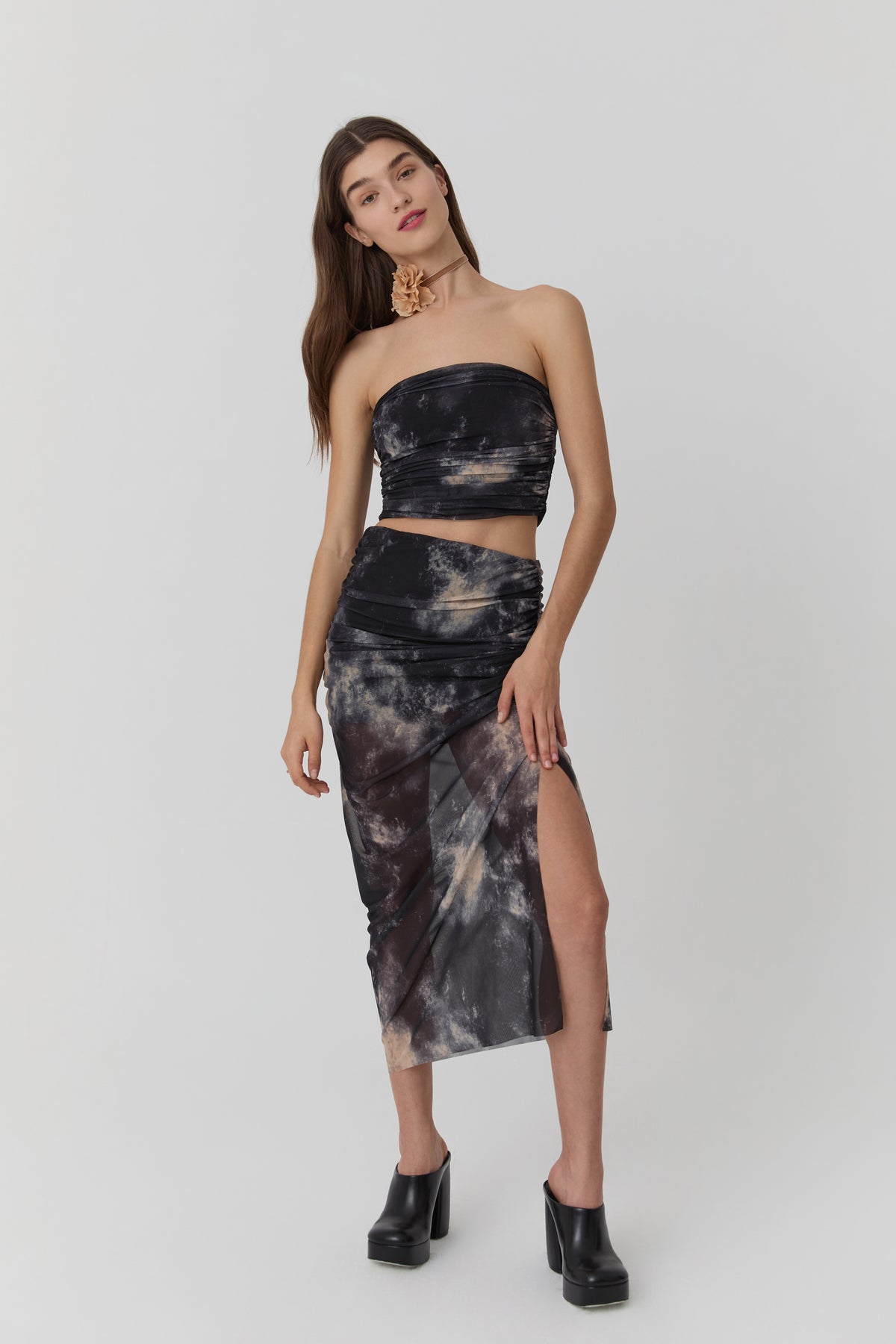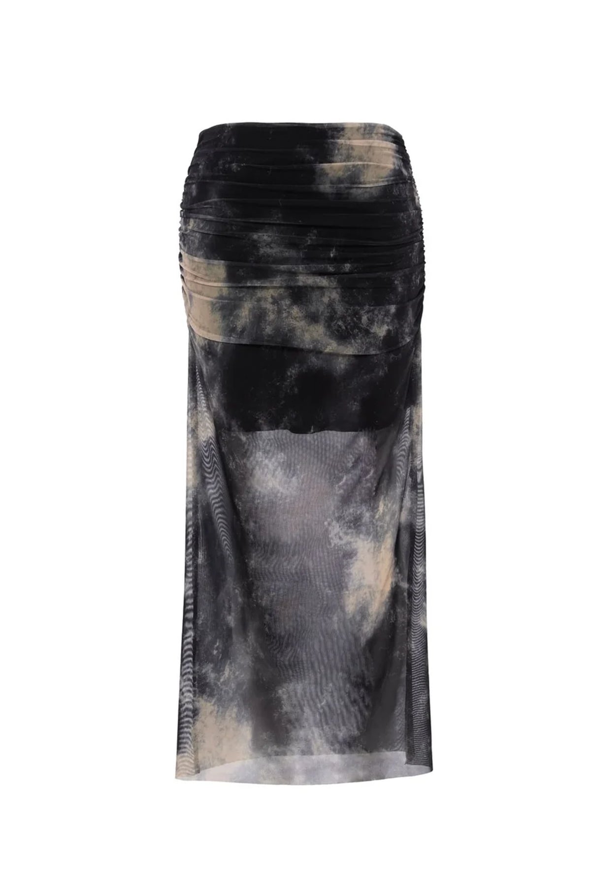 Drape Detaylı Desenli Tül Etek Siyah
