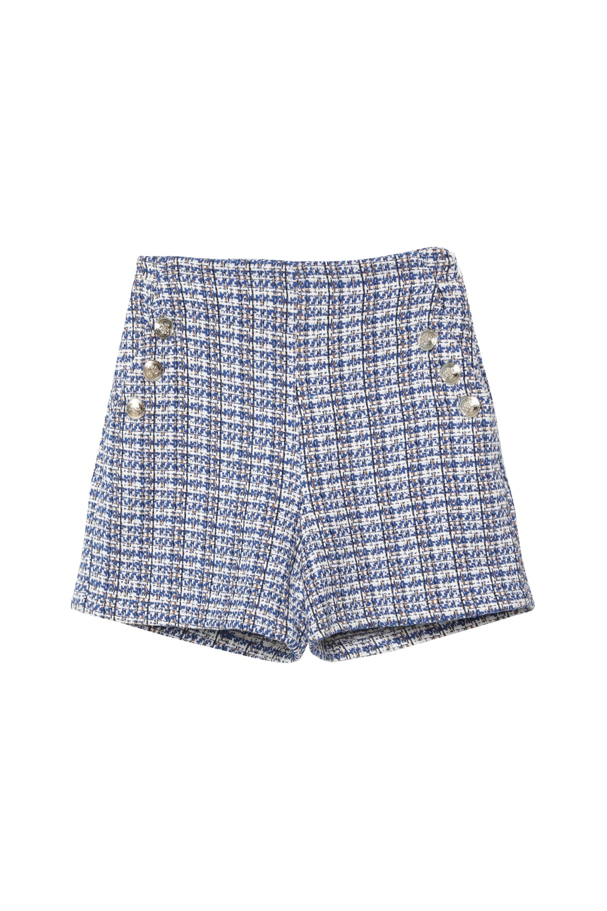 Mini length tweed shorts with cotton content, high waist, pockets with button fastening details, concealed side zip fastening, gold button fastening, pockets and cream lining inside pockets.