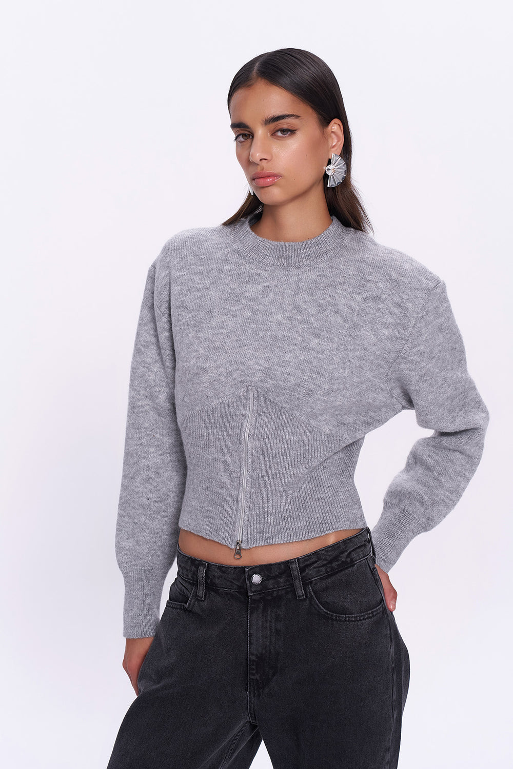 Fermuar Aksesuarlı Uzun Kol Triko Gri