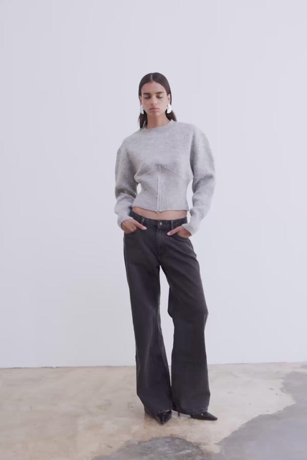 Fermuar aksesuar detaylı, uzun kollu triko kazak.