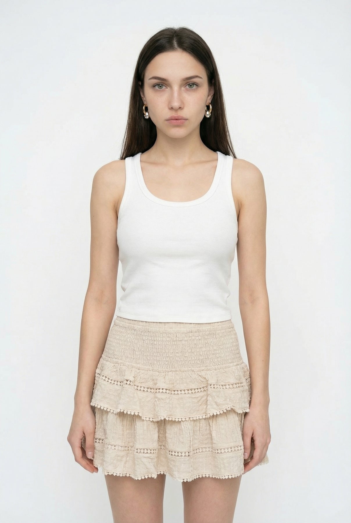 Astarsız, yuvarlak yaka, kalın askılı, sırtı halter formda, göğüs kısmı pedli, fitilli kumaştan, kolsuz, düz kesim, basic atlet.