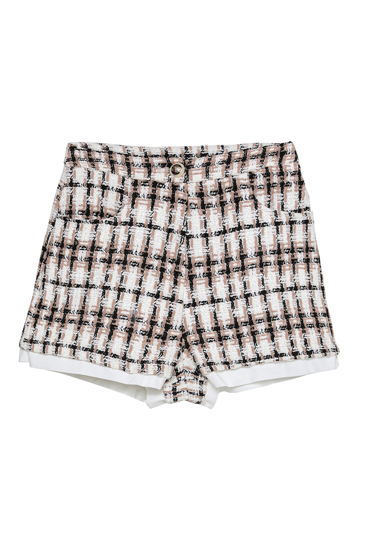 Cotton blend, high waist, garni detail, double pockets, accessory button detail, tweed mini shorts.