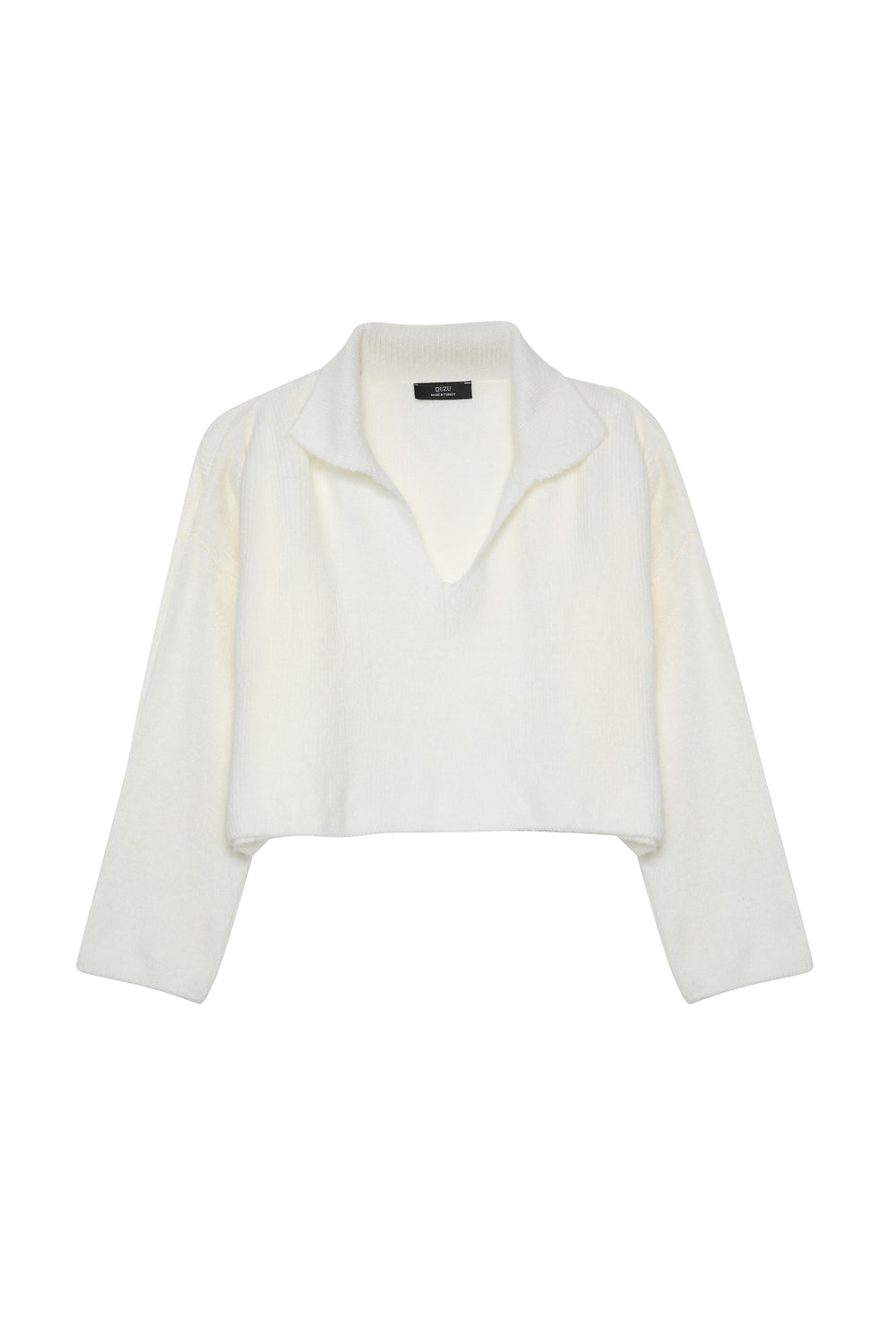 Polo neck, long sleeve, relaxed fit, crop knit sweater.