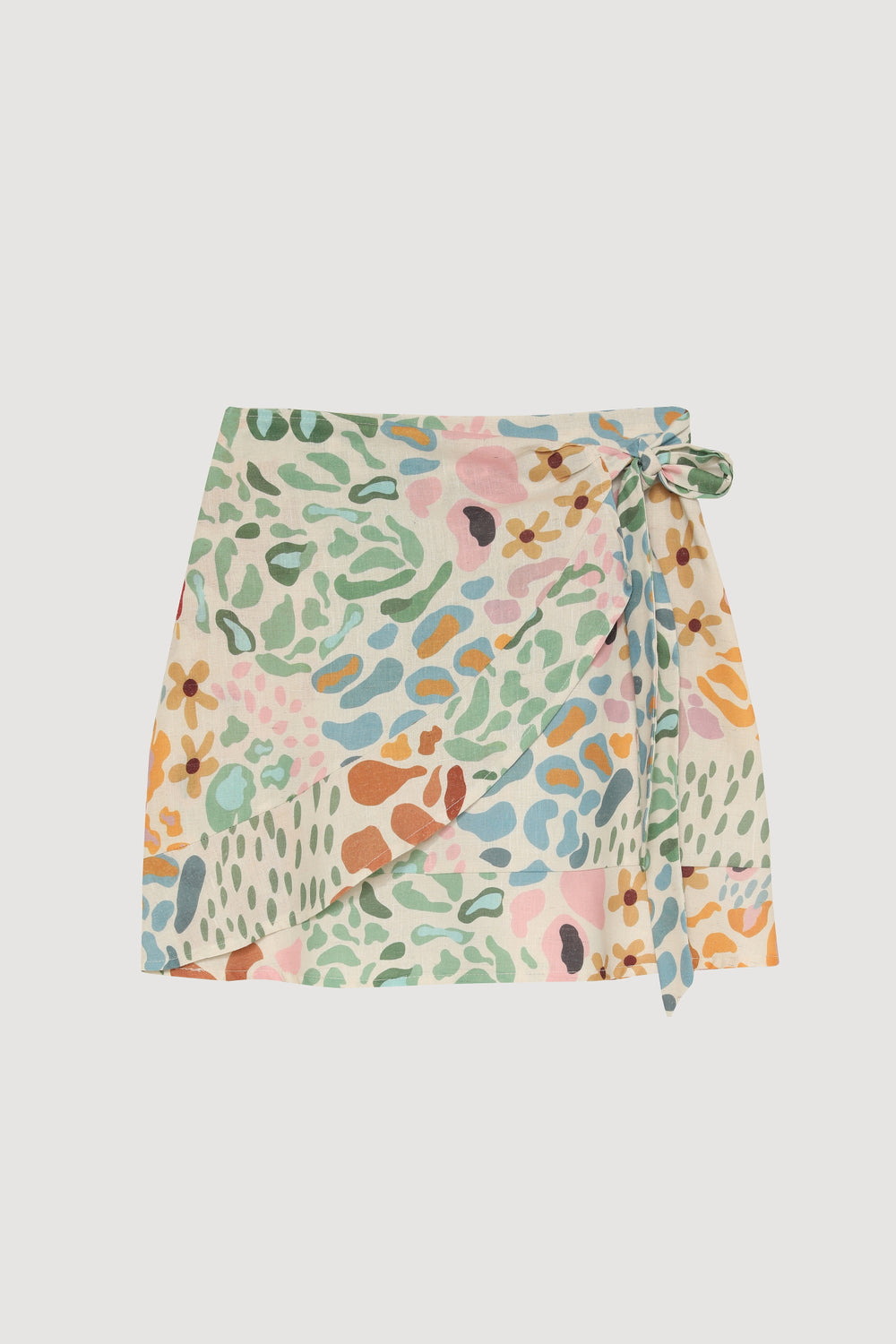 Kruvaze Bağlamalı Renkli Desenli Keten Mini Etek Naturel