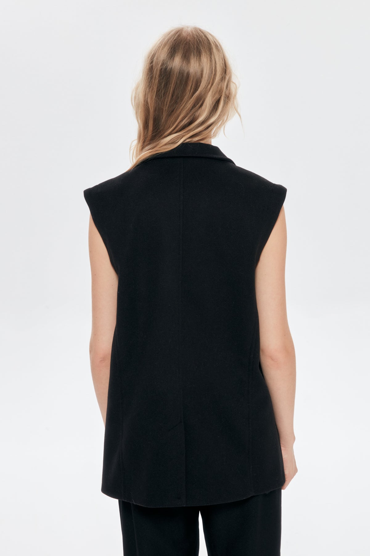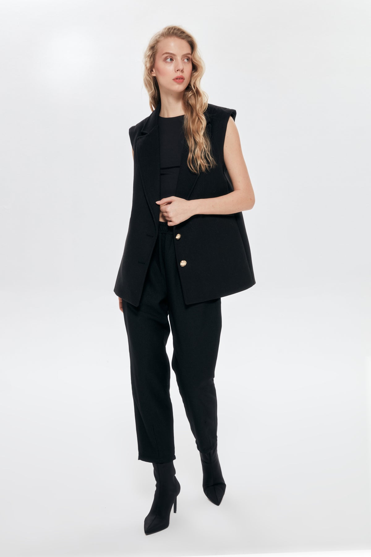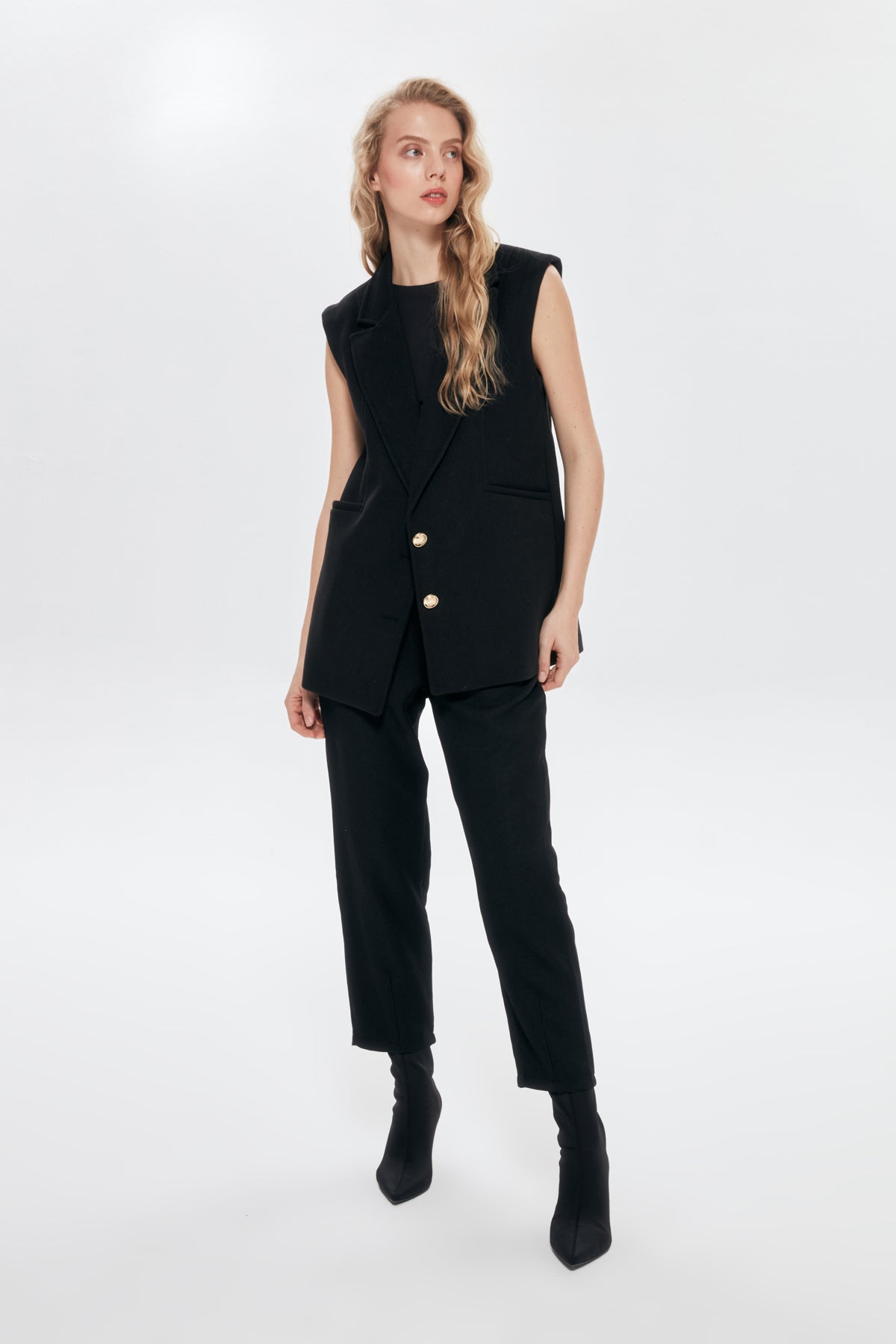 Kruvaze yaka, İçİ astarlı, gold düğme detaylı, çİft ceplİ, kaşe blazer yelek.