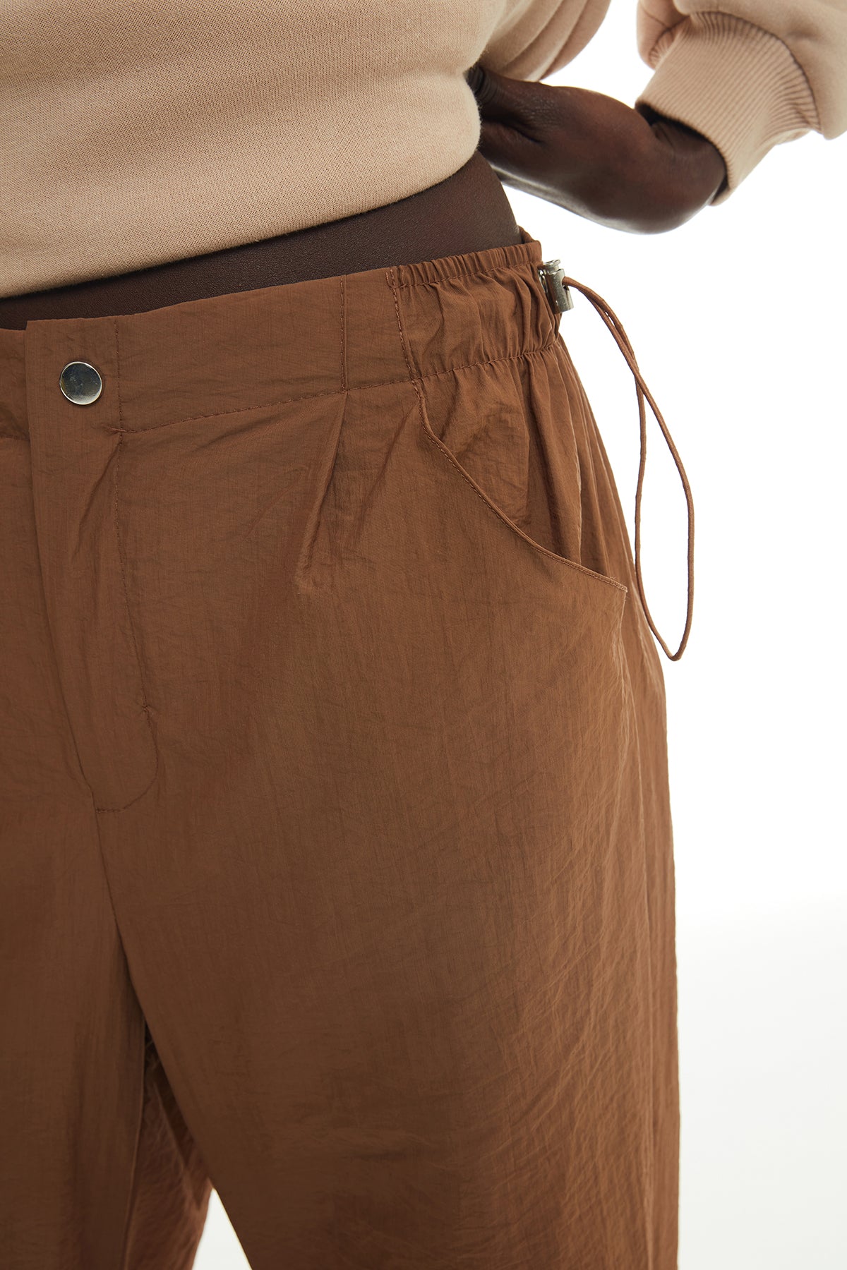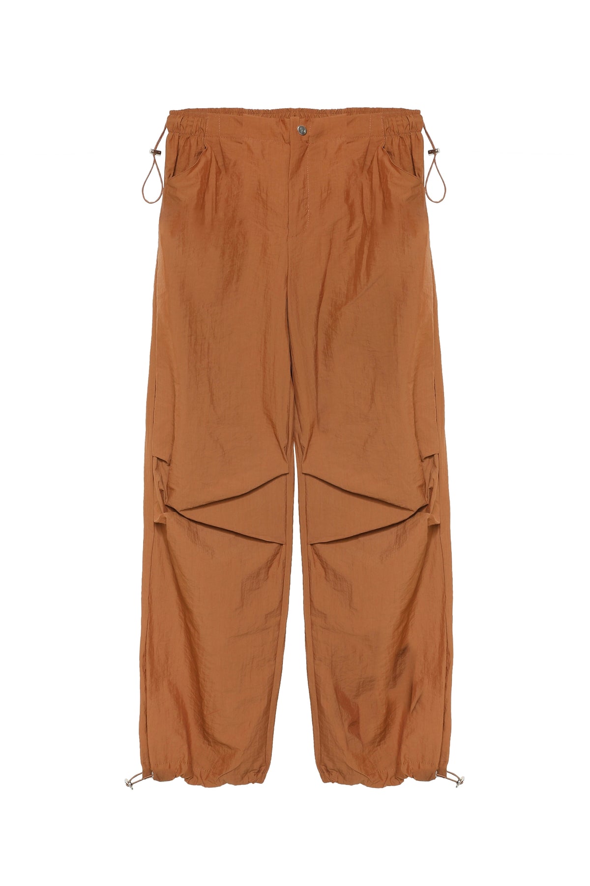High waist, relaxed fit, pocketed parachute trousers with an elasticated and adjustable waist, zip fly and snap button fastening, adjustable hems.