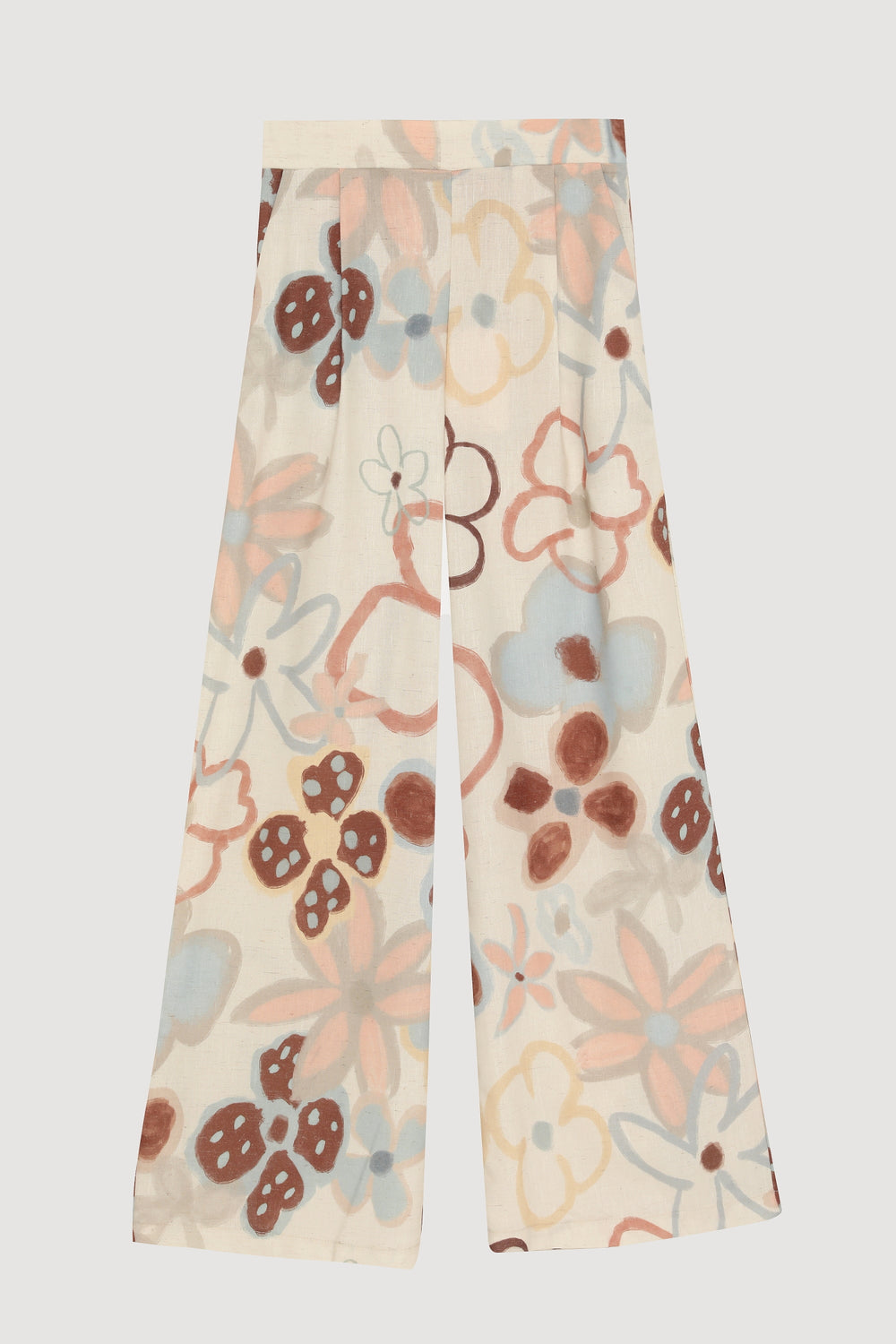 Astarsız, yüksek bel, renkli çiçek desenli, çift cepli, yandan fermuar kapamalı, geniş paça keten pantolon.