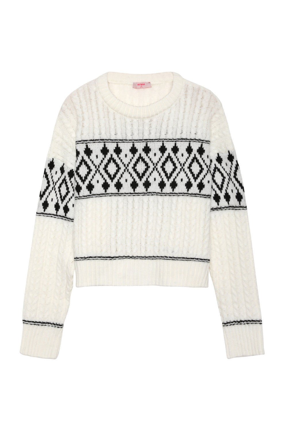 Şerit desen detaylı, bisiklet yaka, uzun kollu triko kazak.