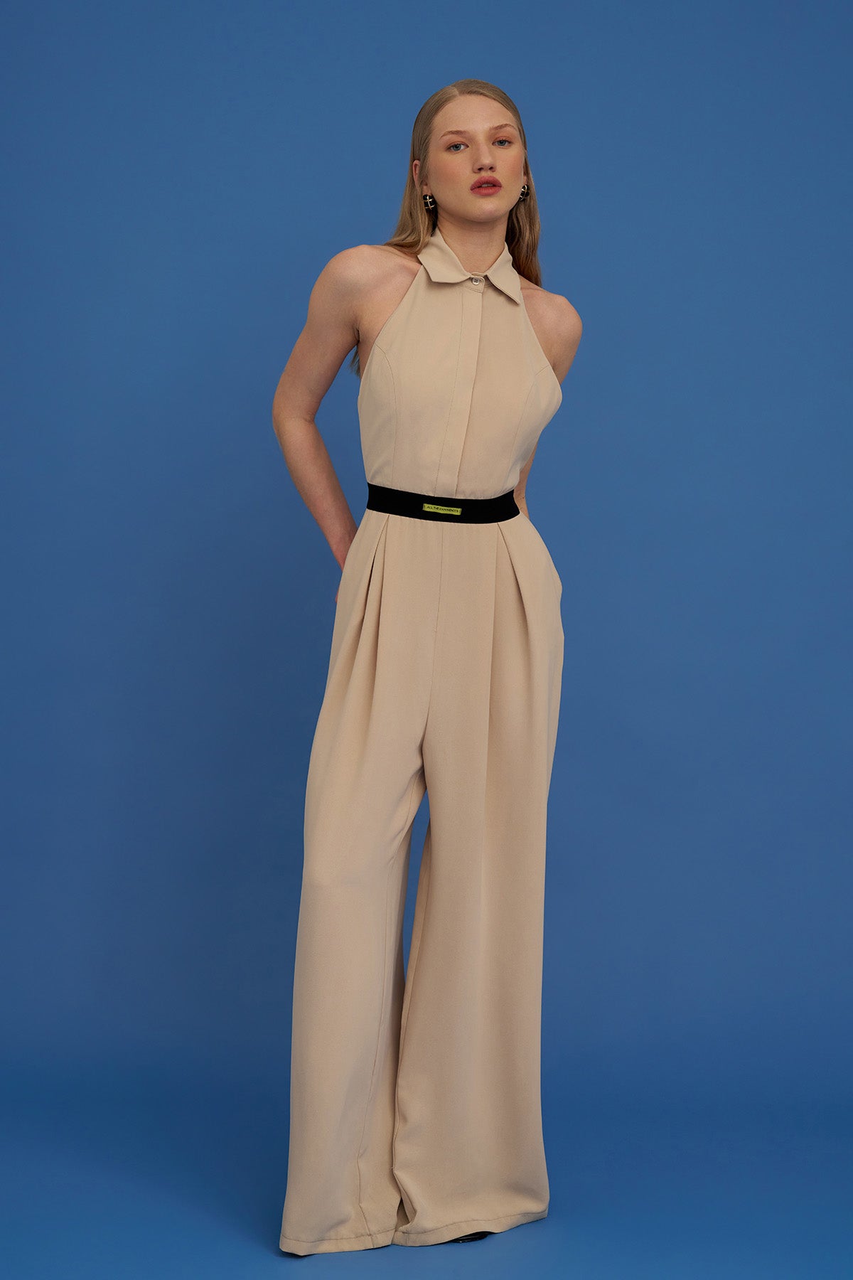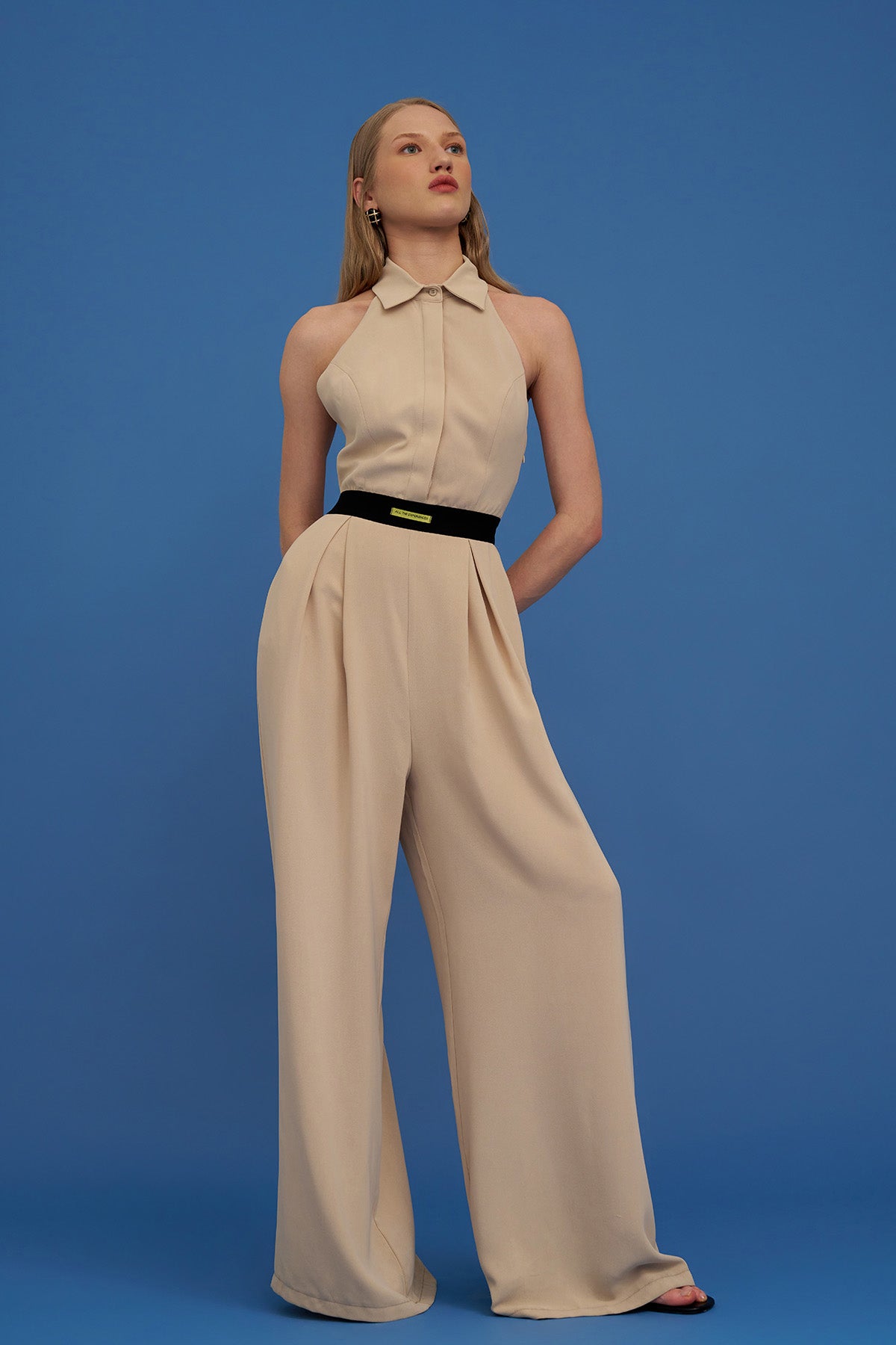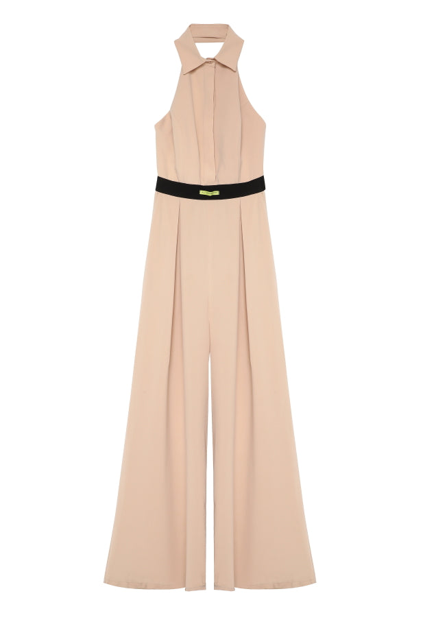 Sırt dekolteli, gömlek yaka, beli lastik detaylı, gizli düğmeli, cep detaylı uzun tulum.