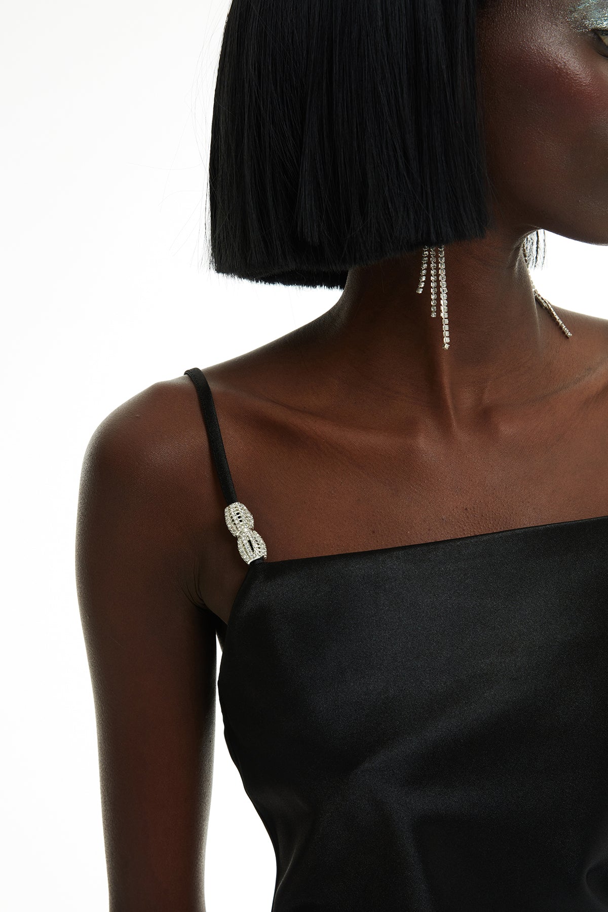 Mini dress with hidden zip fastening on the back, drawstring detail, suspenders, detachable straps, straps with shiny stone details.
