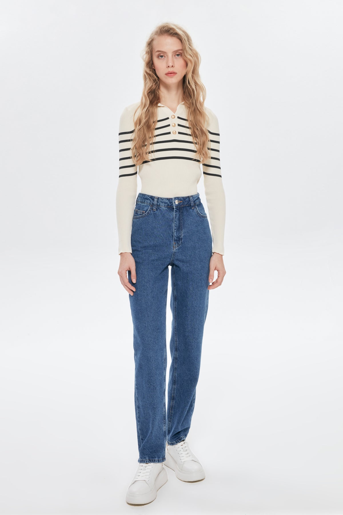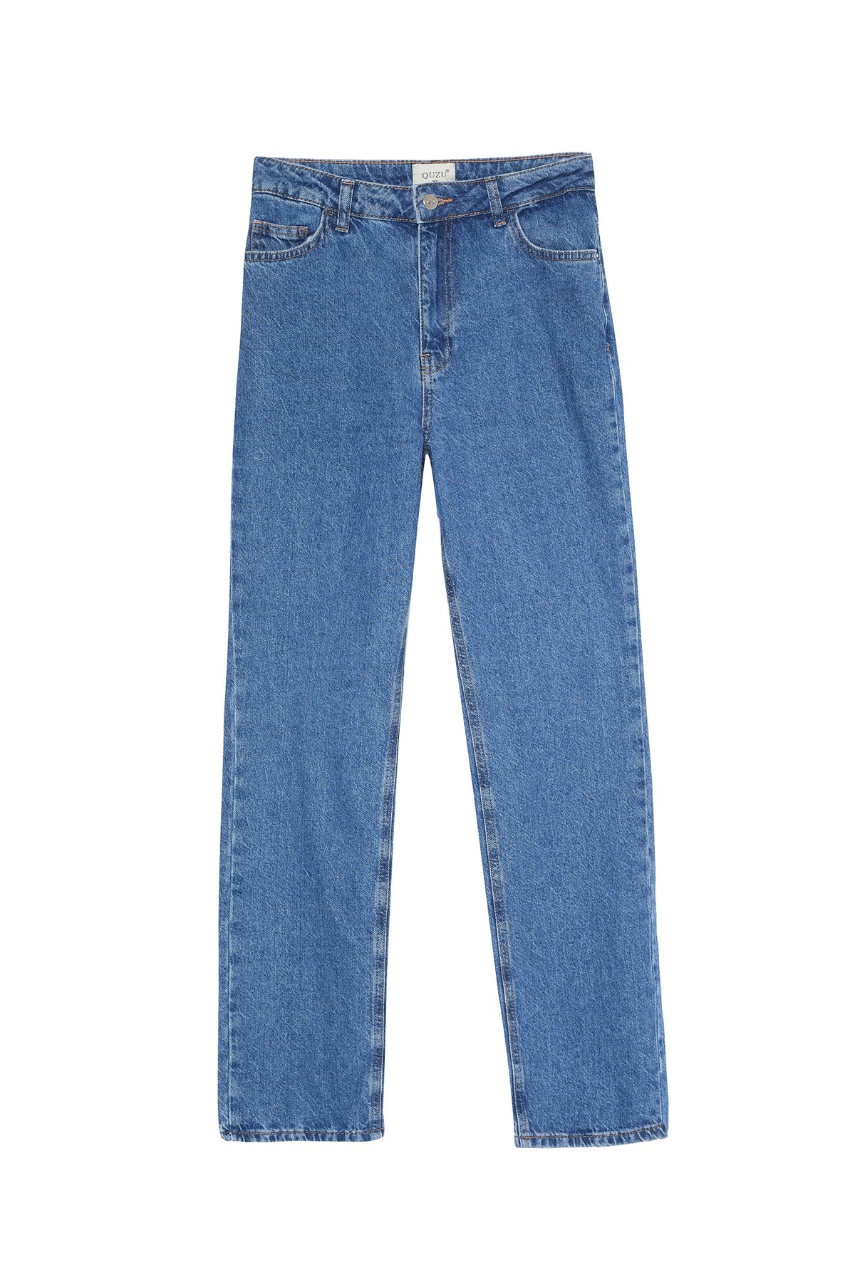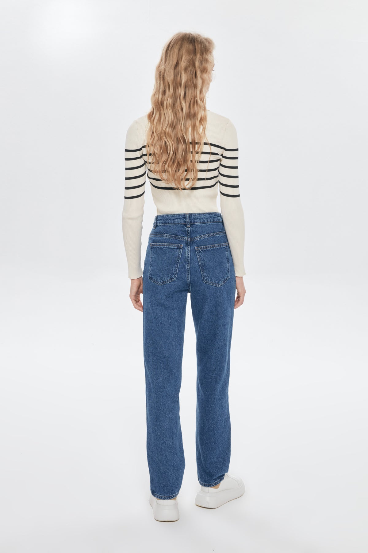 Yüksek bel, düz paça kot pantolon.