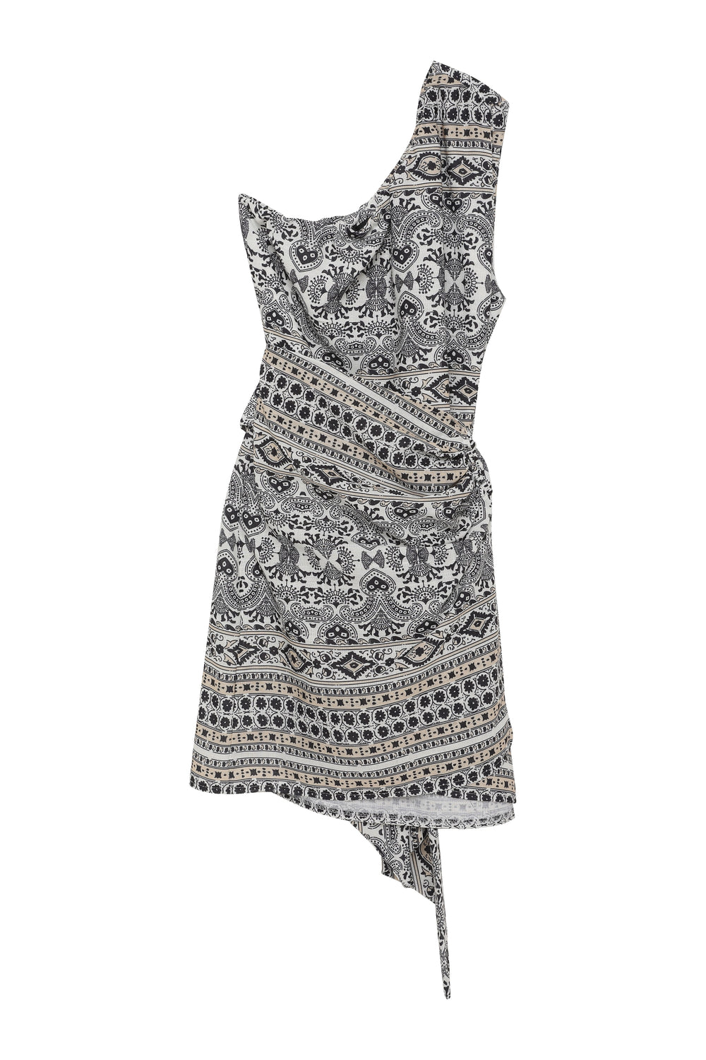 Desenli Kruvaze Bağlamalı Tek Omuz Keten Elbise Siyah