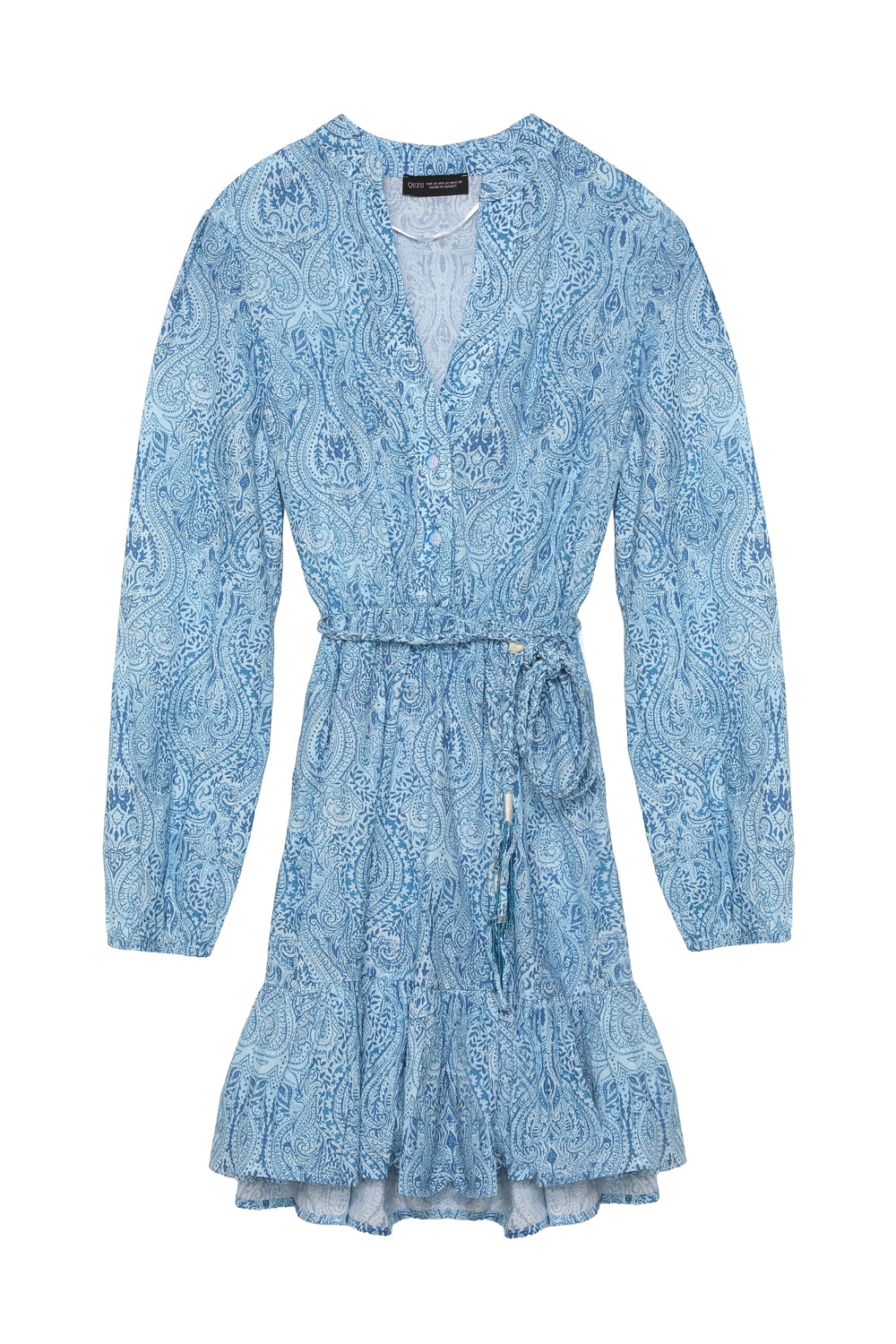 Desenli Düğme Detaylı Mini Elbise Mavi