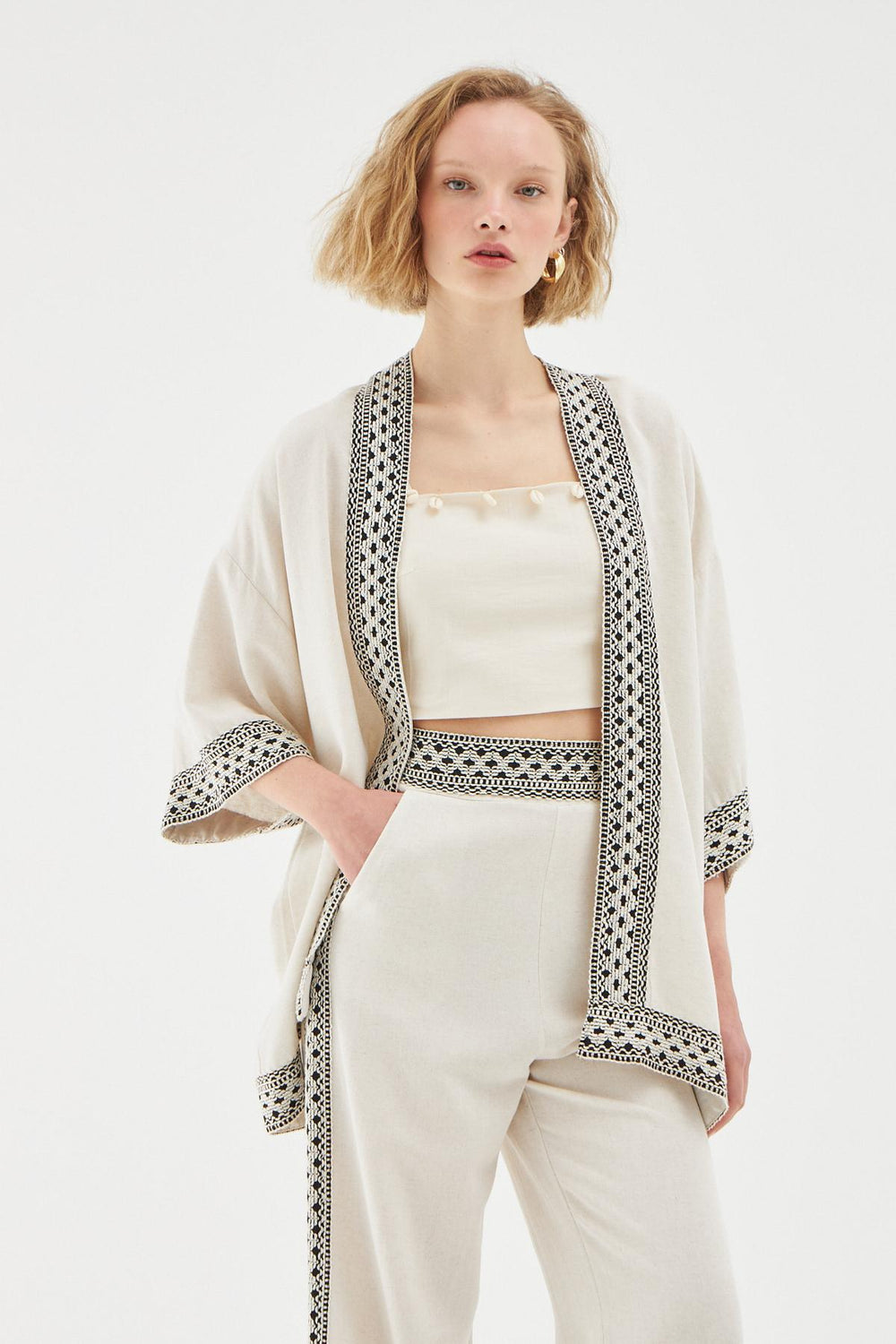 Kenarı Ajur Detaylı Keten Pantolon Naturel