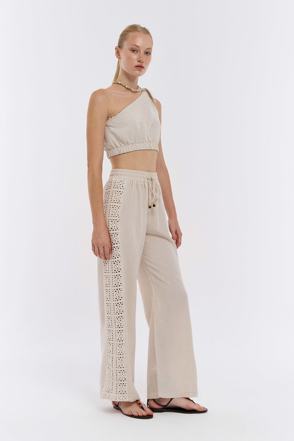 Kenarı Ajur Detaylı Keten Pantolon Naturel