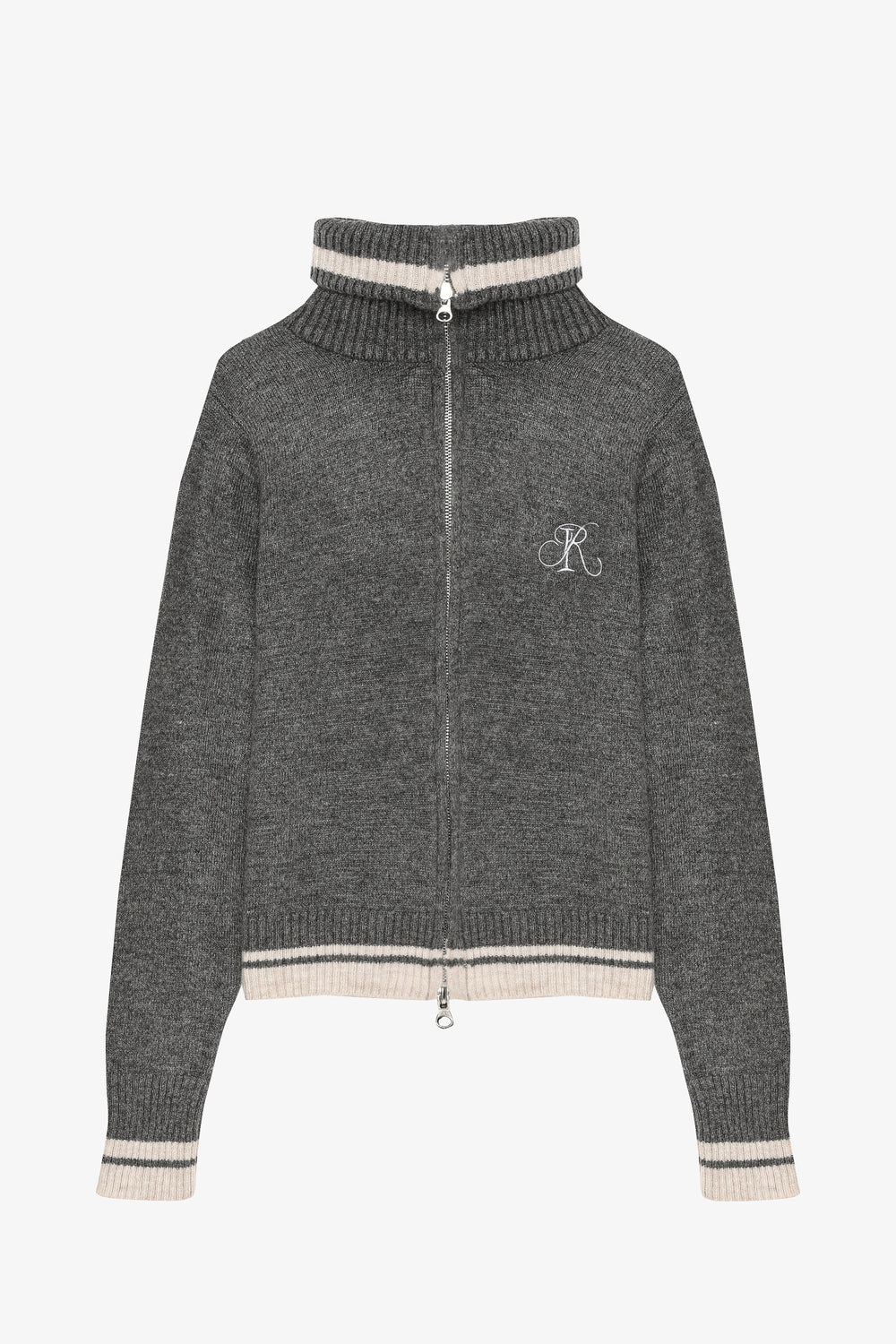 Kontrast şerit detaylı, dik yaka, çift fermuarlı, uzun kollu, yazı nakışlı, kısa boy triko hırka.