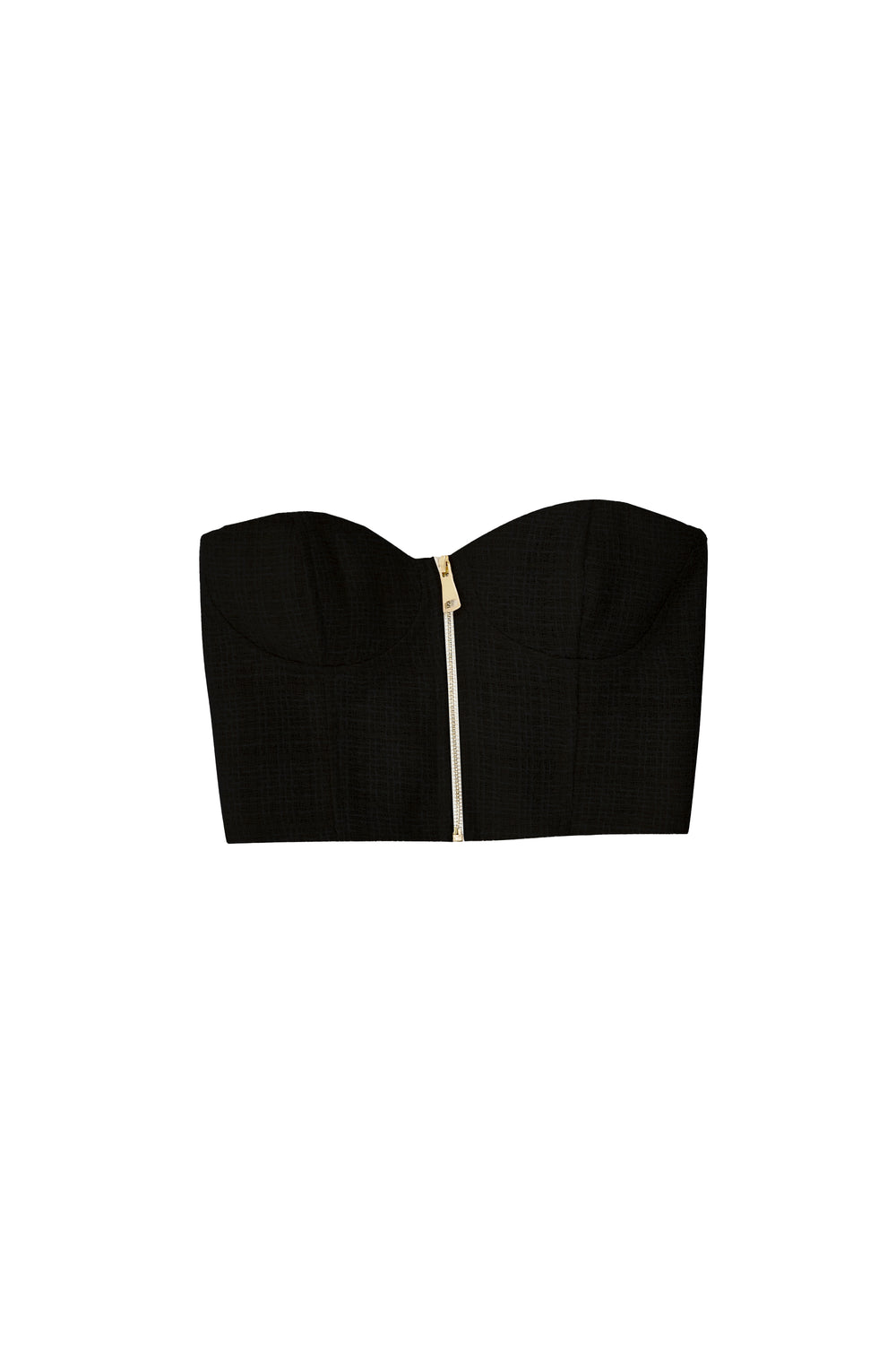 Önden fermuar detaylı, tüvit, straplez crop bluz.