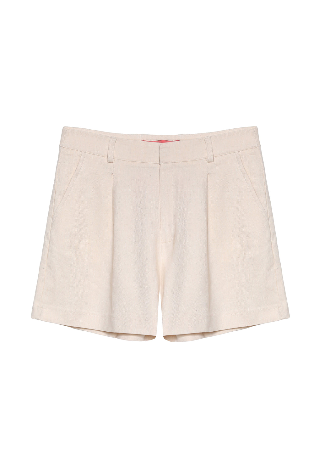 Kırçıl kumaş detaylı, düz kesim, yüksek bel, mini şort.