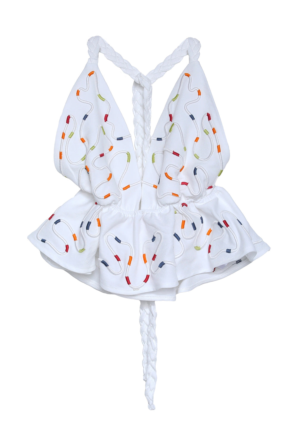Renkli Nakış Detaylı Boyundan Bağlamalı Bluz Ekru