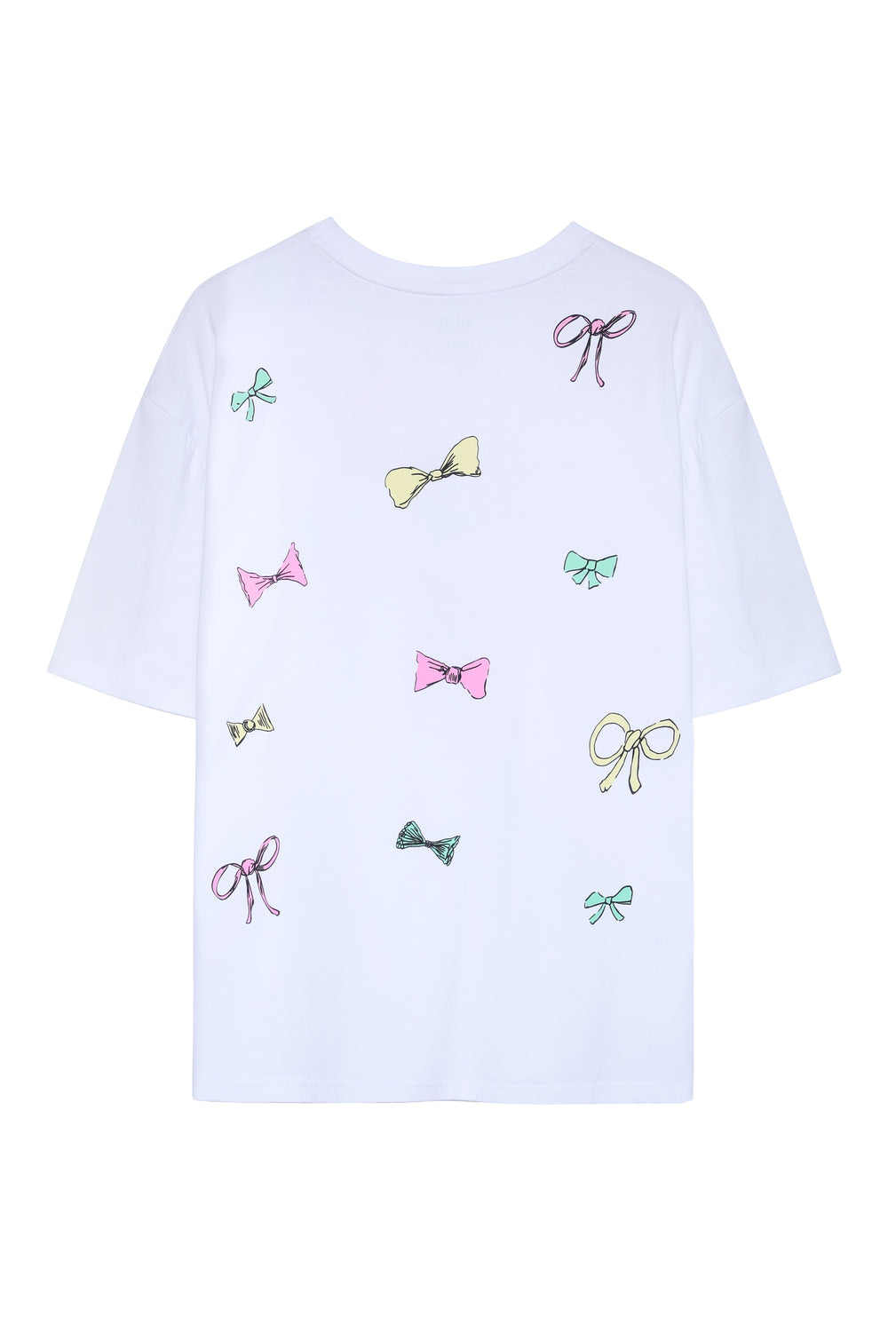 Kısa kol, bisiklet yaka, ön ve arka kısmında renkli fiyonk baskılı tişört.