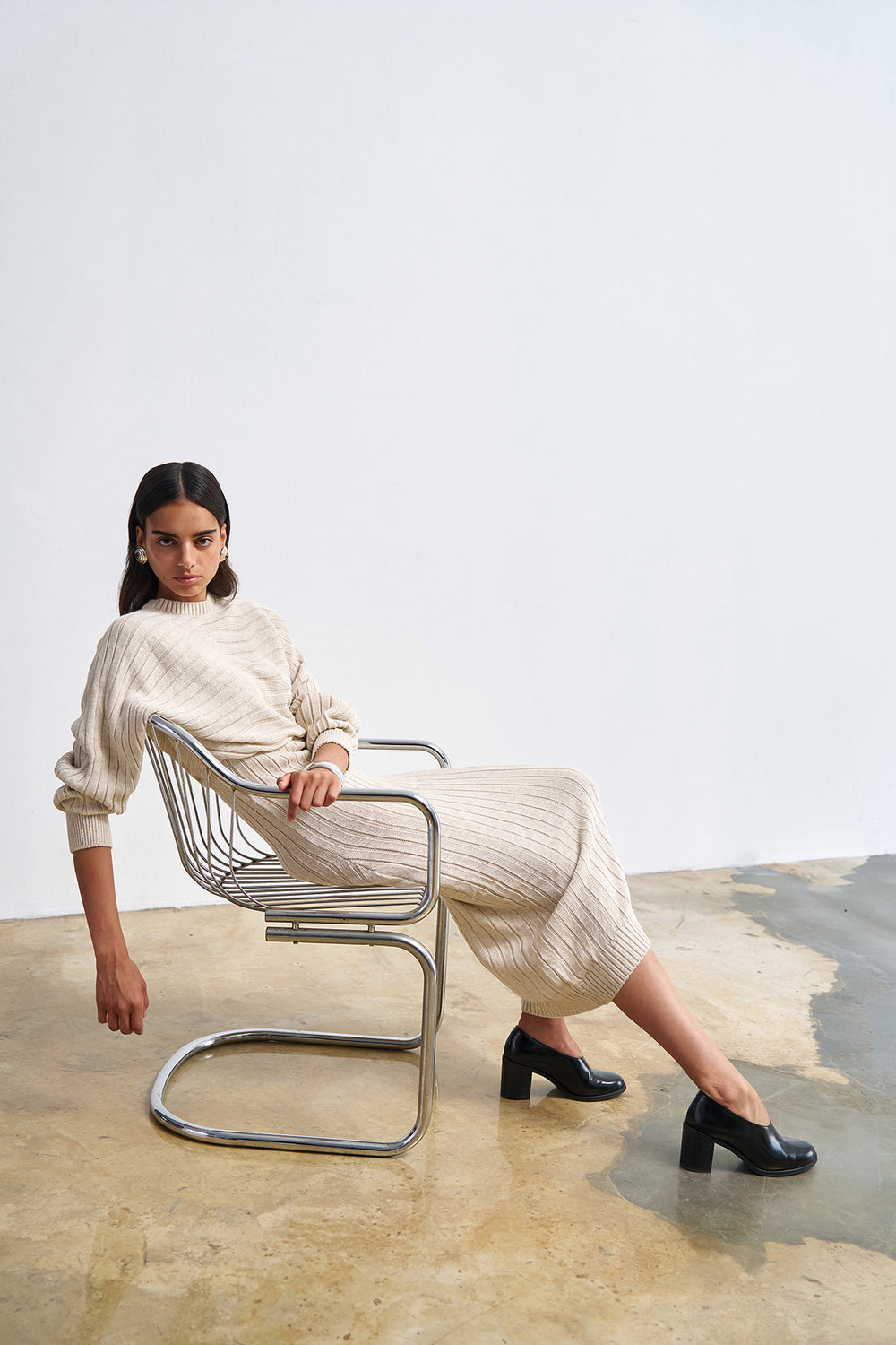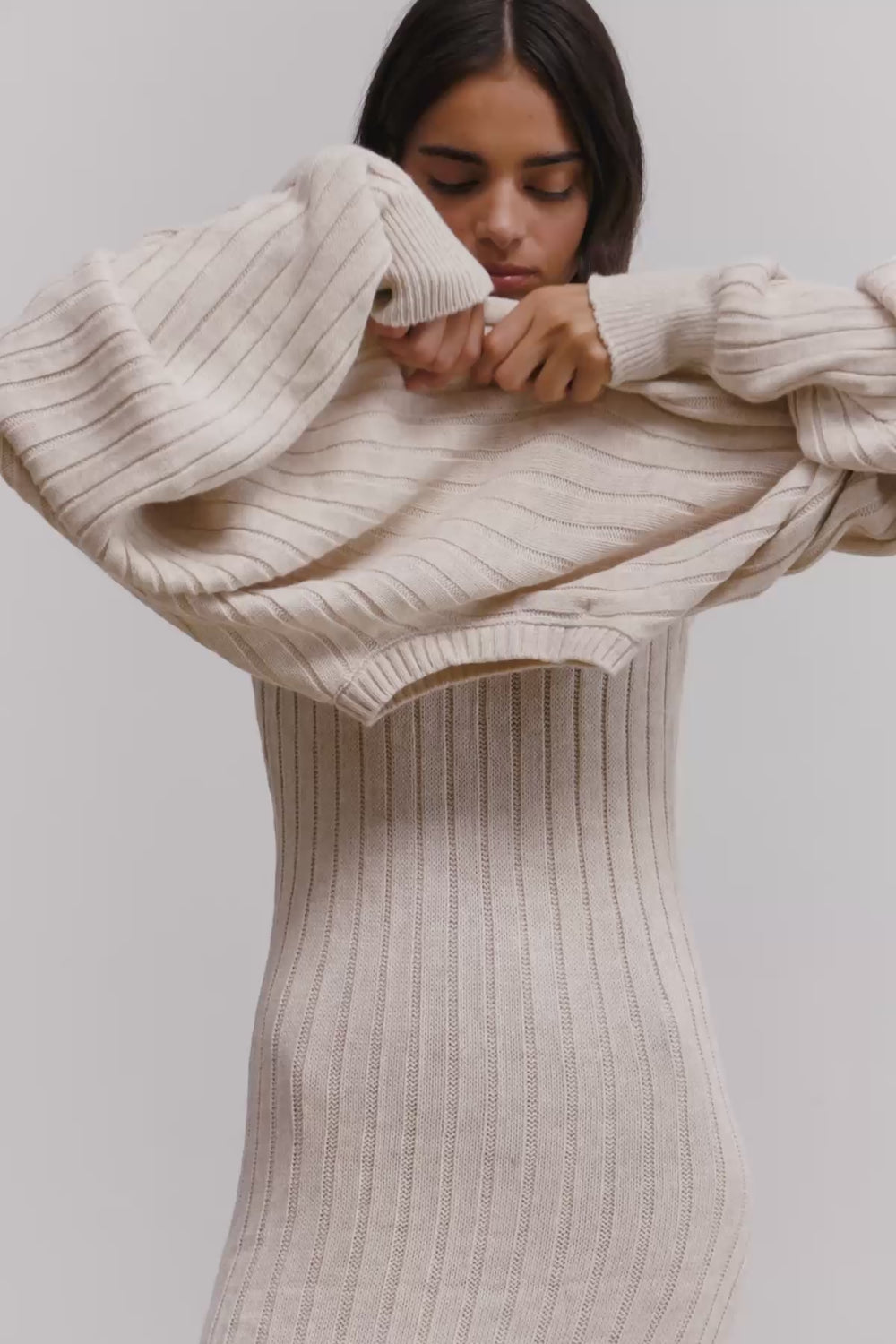 Fitilli dokusuyla dikkat çeken, uzun kol, midi boy, askılı elbise bolero triko takımı.