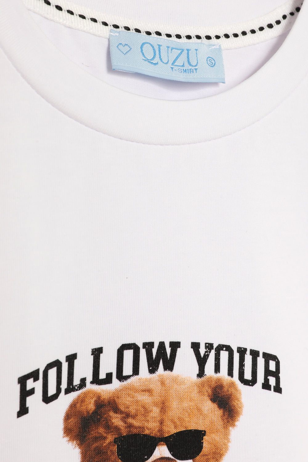 Ayıcık Desenli Kısa Kol Tişört Beyaz