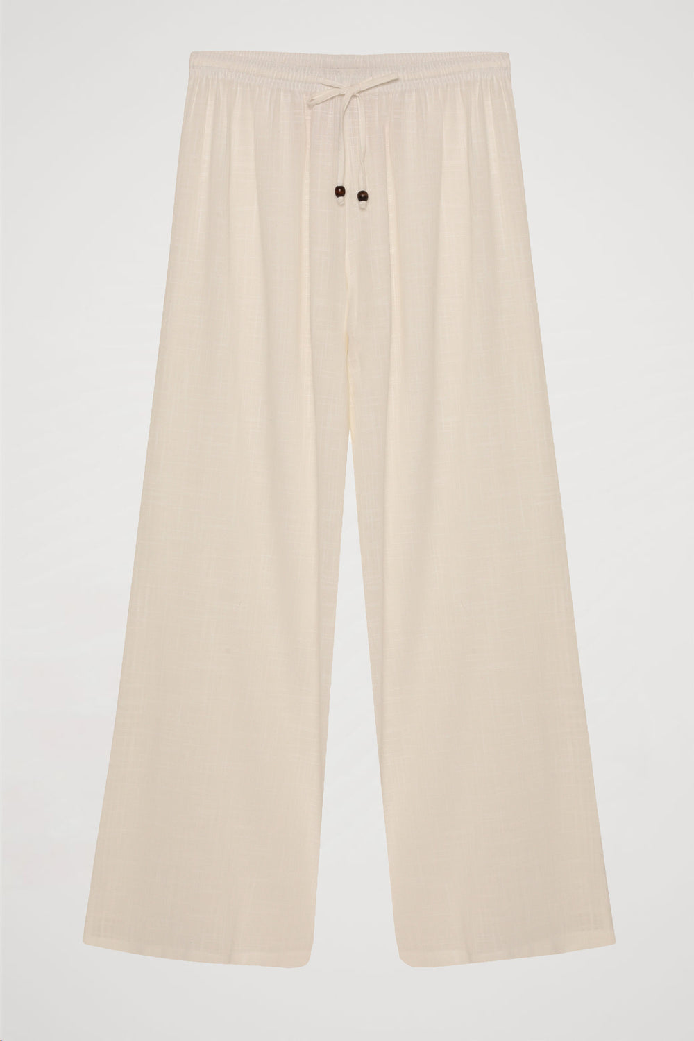 Lastikli yüksek bel, ahşap boncuk detaylı bağcıklı, bol paça pantolon.