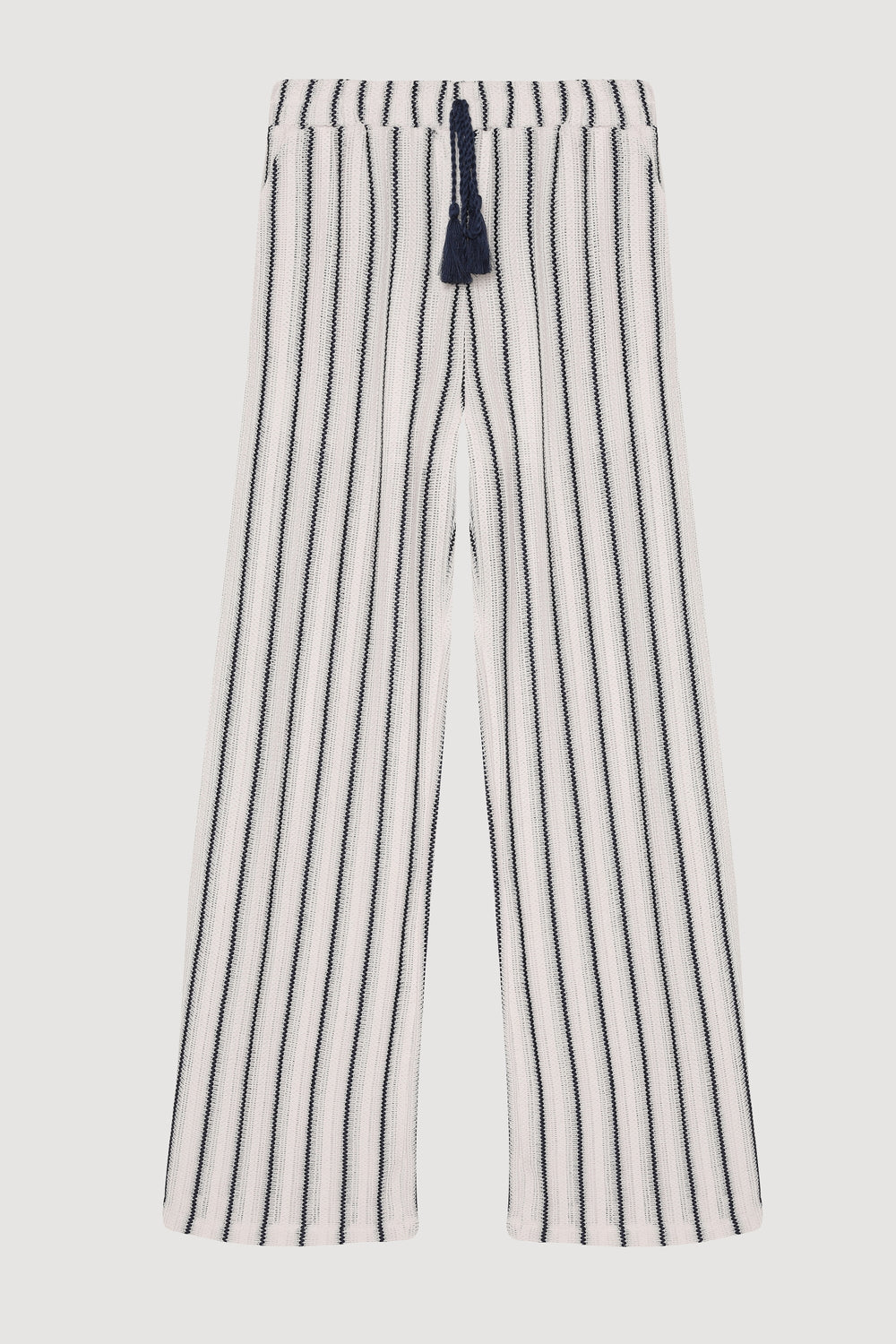 Bağcık ve Püskül Detaylı Çizgili Pantolon Ekru