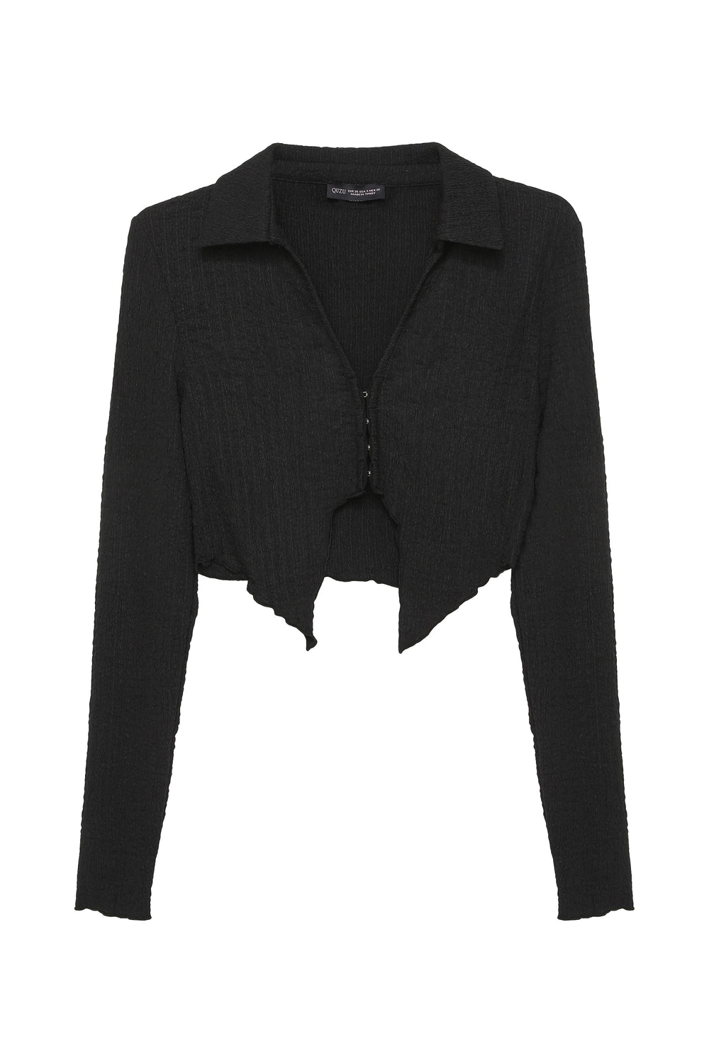 Uzun kollu, dokulu kumaş, önden agraf kapatmalı, V yaka detaylı, bağlamalı crop bluz.