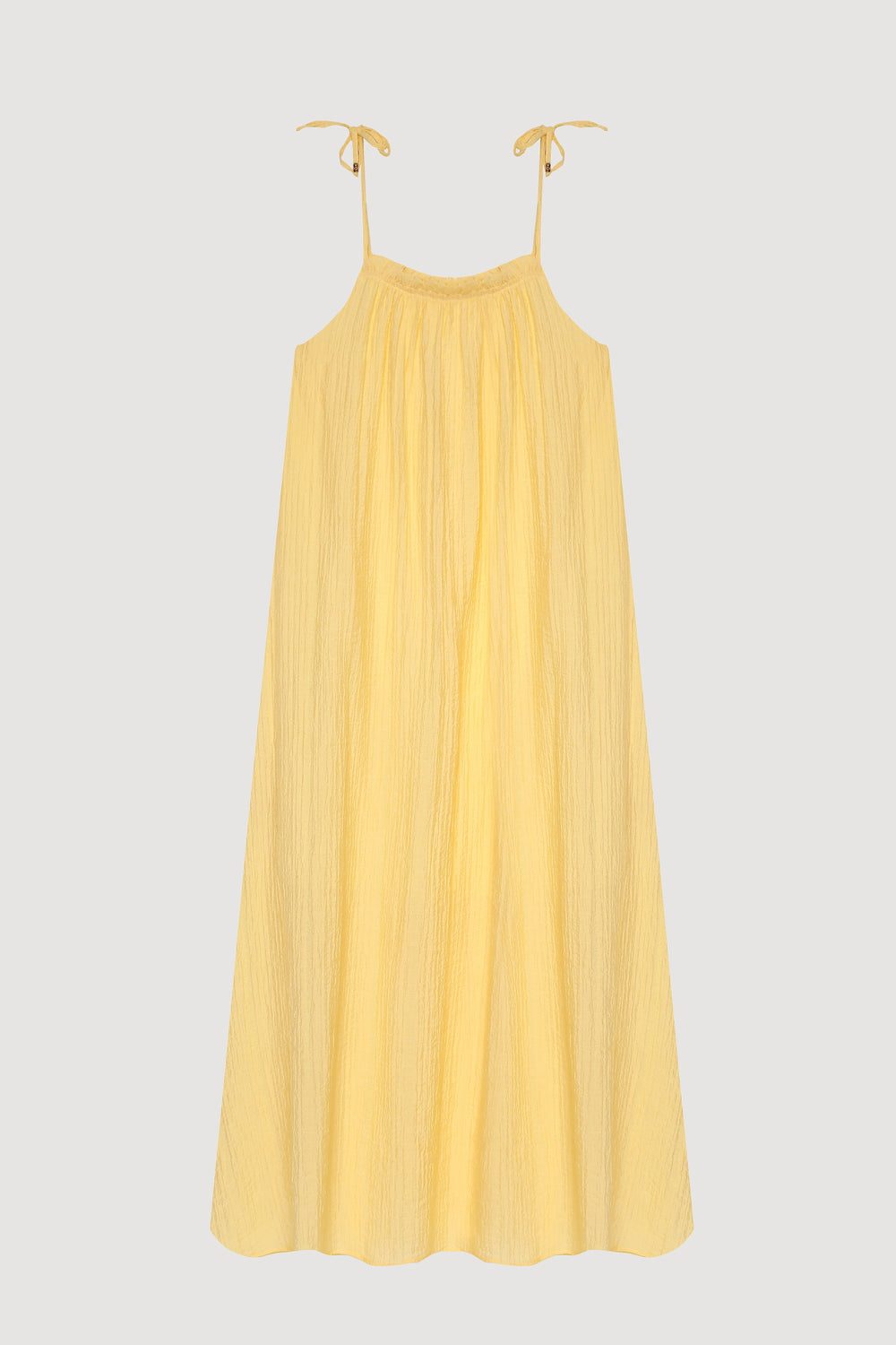 Bağlama İp Askılı Gofre Uzun Elbise Sarı
