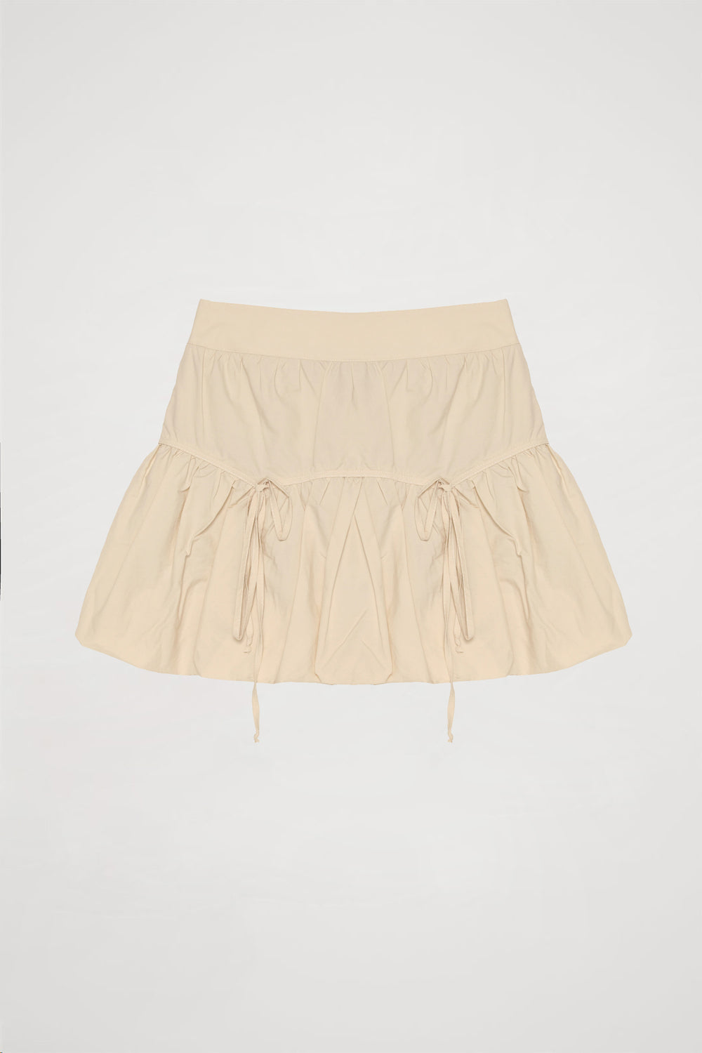 İçi astarlı, önü büzgü bağlama detaylı, yüksek bel, yandan fermuar kapamalı, modern ve şık görünümlü mini boy balon etek.