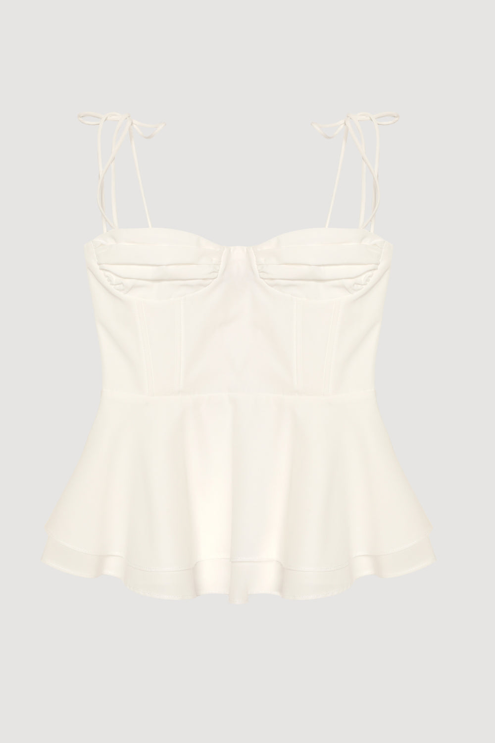 İnce bağlamalı askılı, astarsız, balenli, kapsız, sırtı lastikli, yandan fermuarlı, çift katlı kloş etek uçlu bluz.