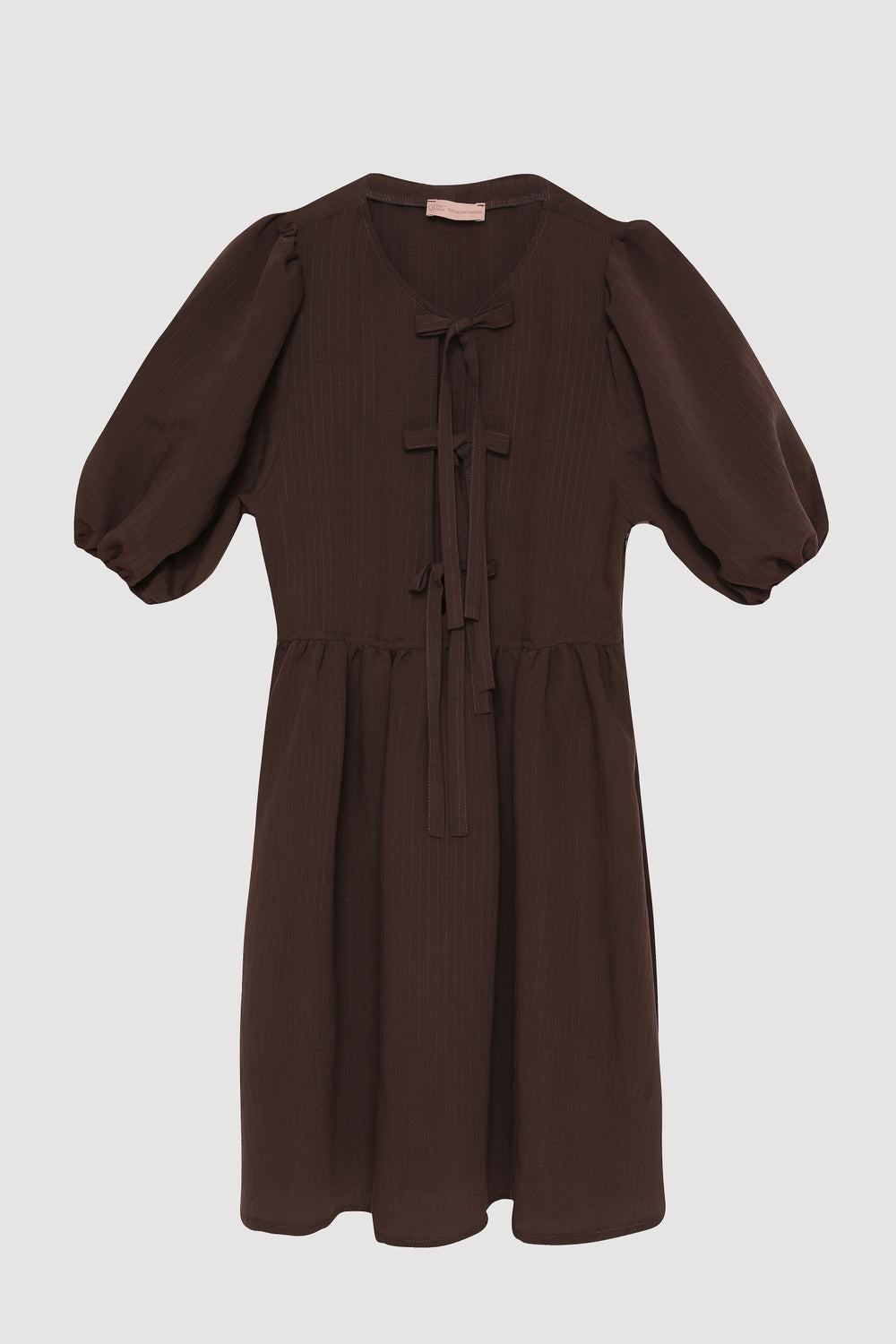 Balon Kol Fiyonk Bağlamalı Mini Elbise Kahverengi