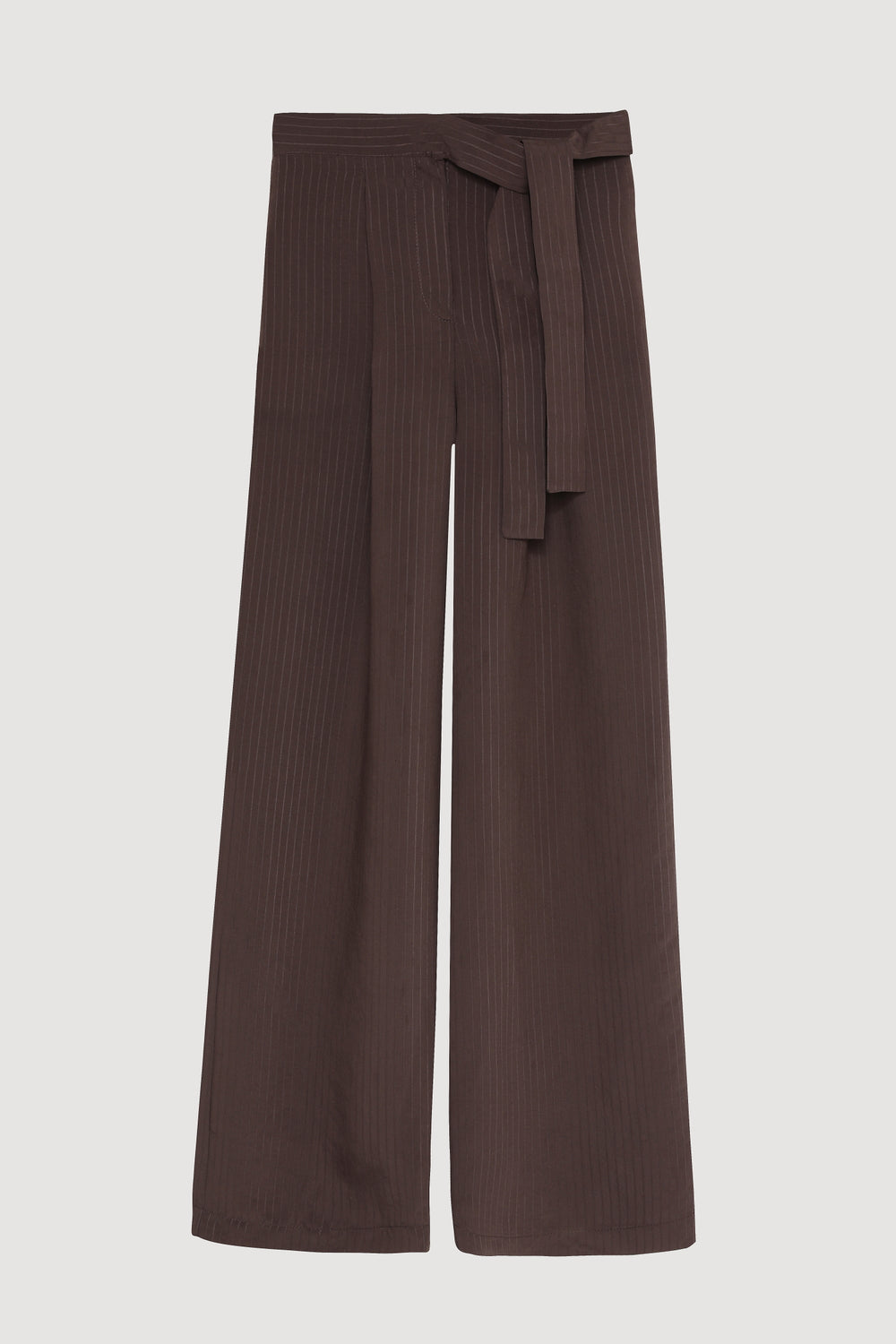 Kendi kumaşından kuşak detaylı, yüksek bel, bol paça, astarsız, çift cepli, hafif dokulu kendinden çizgili uzun pantolon.