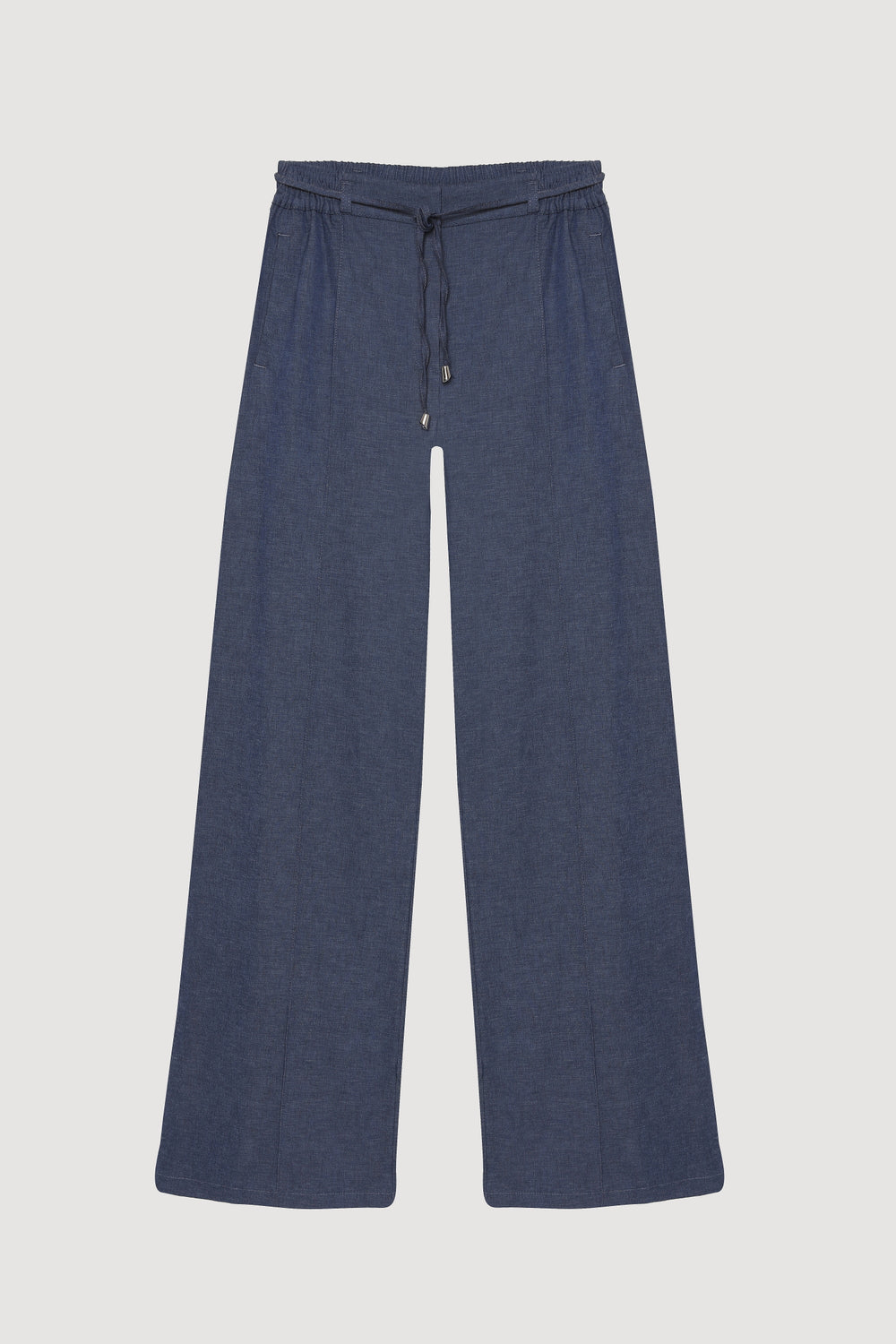 Beli büzgülü aksesuar bağcıklı, çift cepli, düz kesim, önden dikiş detaylı, kot görünümlü, bol paça pantolon.