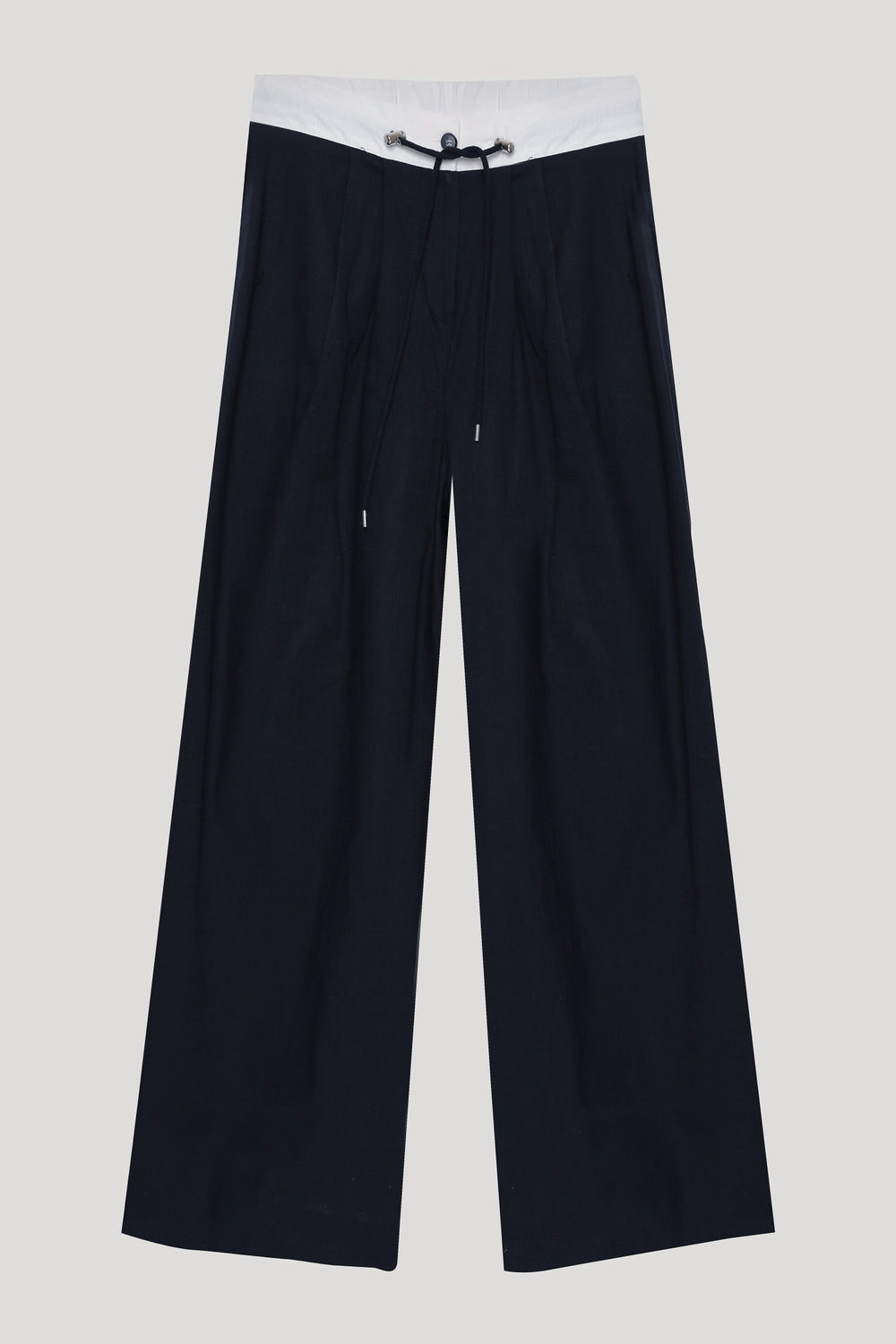 Beli garnili, beli ip lastikli, yüksek bel, geniş paça, çift cepli, modern ve şık görünümlü palazzo pantolon.