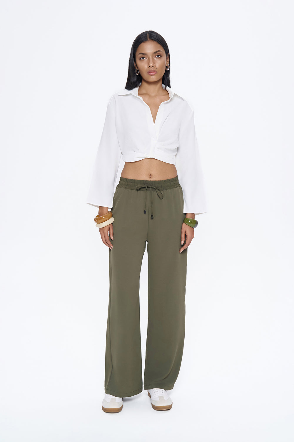 To get a feminine look, the knot detailed blouse model is one of the pieces you should give a chance. The crop blouse model will add elegance to its combinations with the slit detail, the arm posture and the shirt collar detail. The back waist is elasticated and has a hidden zipper.