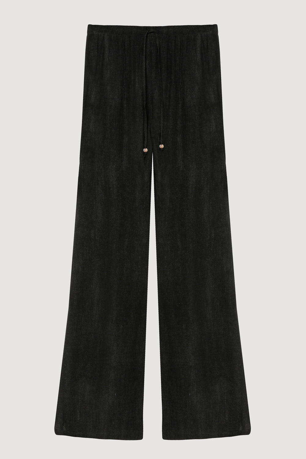 Beli lastikli, bağcık bağlama detaylı, desenli, bol paça, ince kumaştan, yüksek bel, çift cepli, rahat kalıp pantolon.